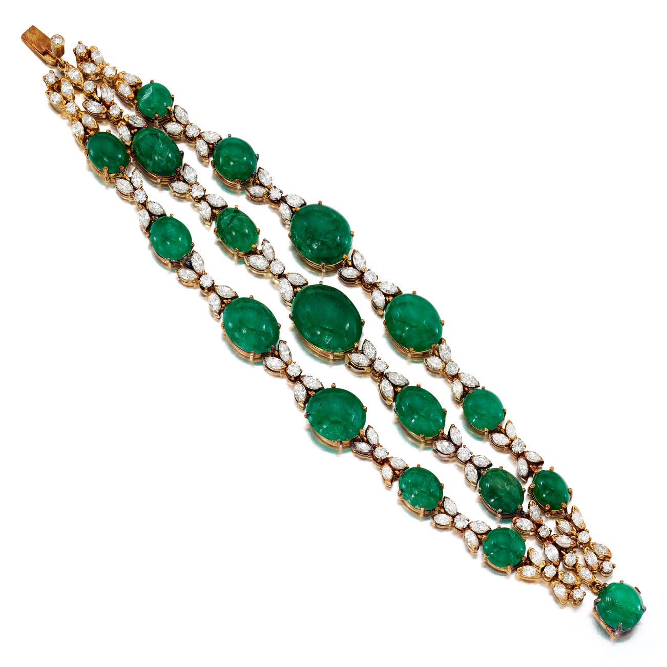 Composed of three rows set with cabochon emeralds measuring from approximately 7.0x 7.3 x 3.9mm to 16.0 x 12.0 x 6.7mm, accented by marquise-shaped and brilliant-cut diamonds, mounted in yellow gold, length approximately 6 1/2 inches.