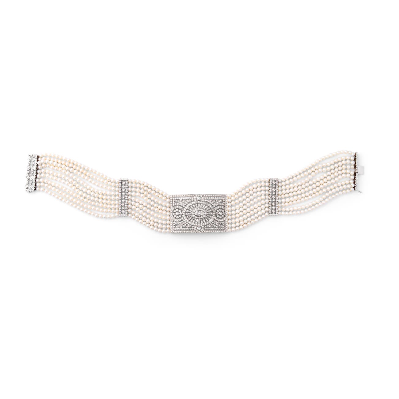 Composed of nine strands of cultured pearls, the openwork rectangular plaque, the spacers and the clasp of geometric design, set throughout with brilliant-cut diamonds, length approximately 310mm.