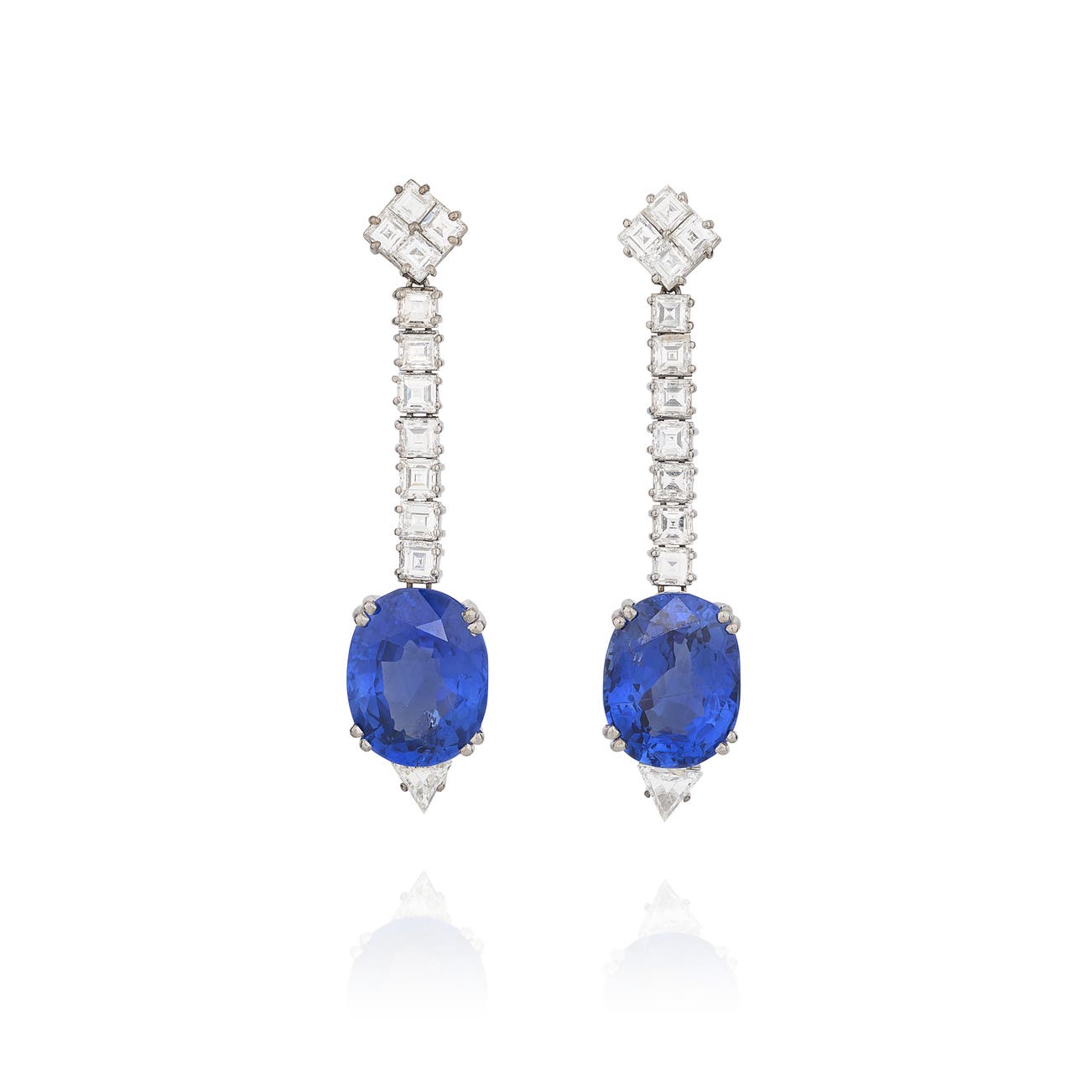 Each set with an oval sapphire weighing 5.75 and 5.86 carats respectively, accented with step-cut diamonds, length approximately 40mm, Italian assay marks for gold, post and butterfly fittings.