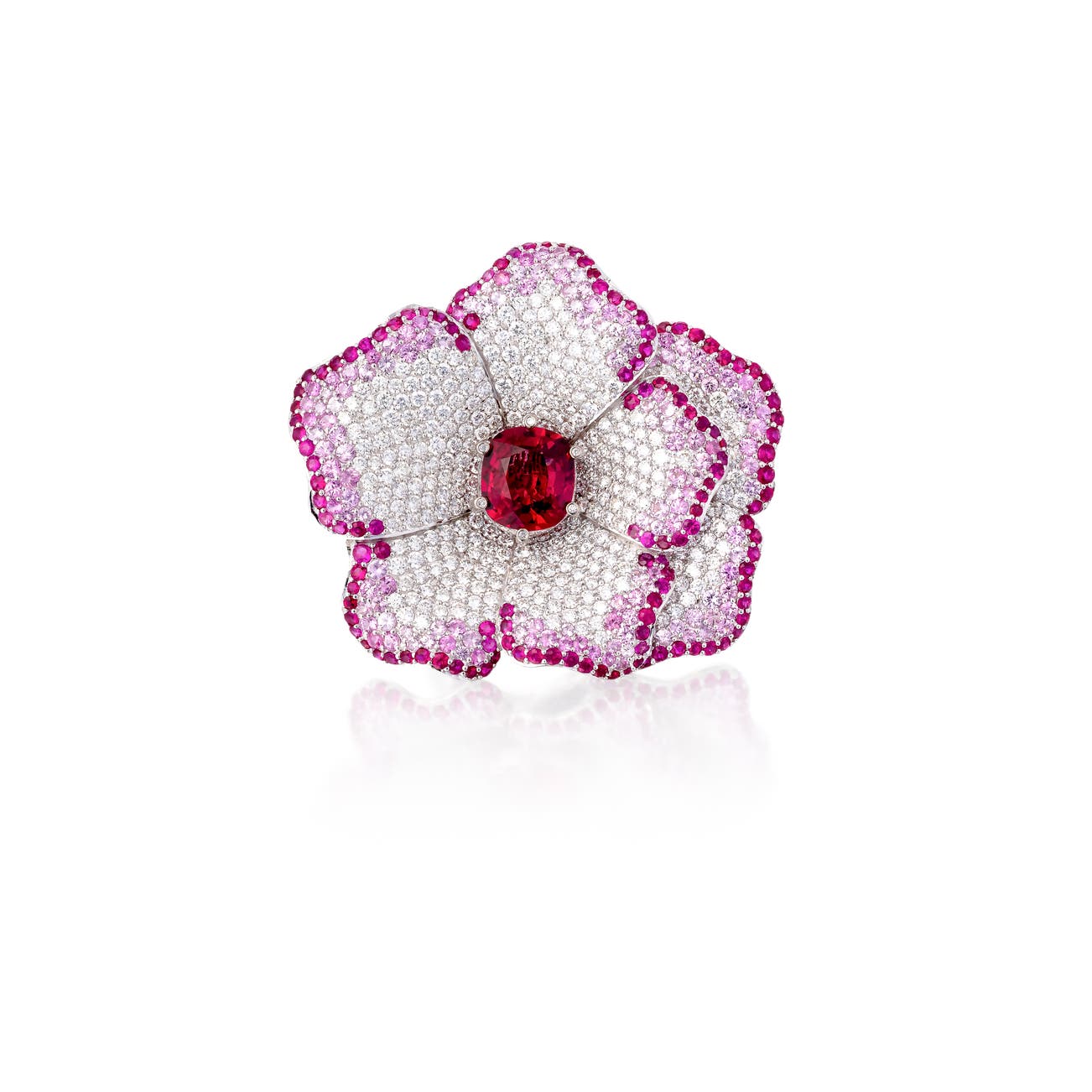 Designed as a flowerhead, set with a cushion-shaped spinel weighing 3.43 carats, embellished with brilliant-cut diamonds and circular-cut spinels, the shank modelled as intertwined thorned branches, size 55, signed Laut for Alexander Laut, numbered.