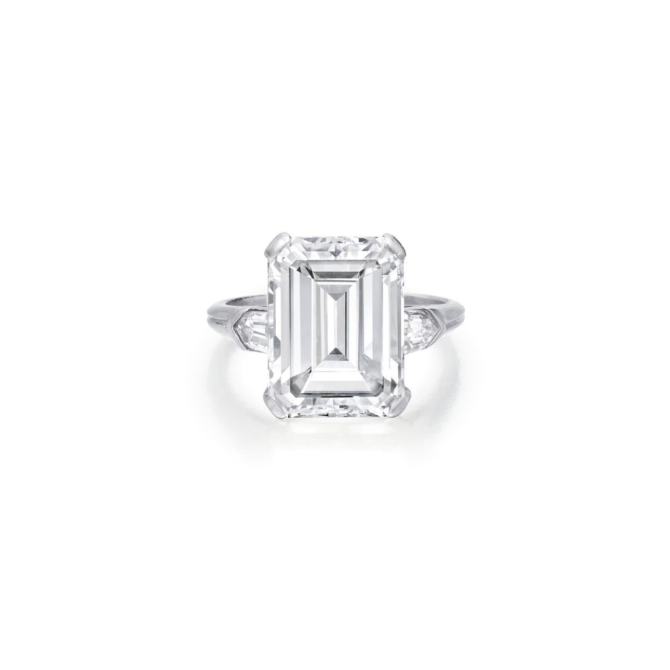 Set with a step-cut diamond weighing 6.04 carats, flanked by bullet-shaped diamonds, mounted in platinum, size 5.