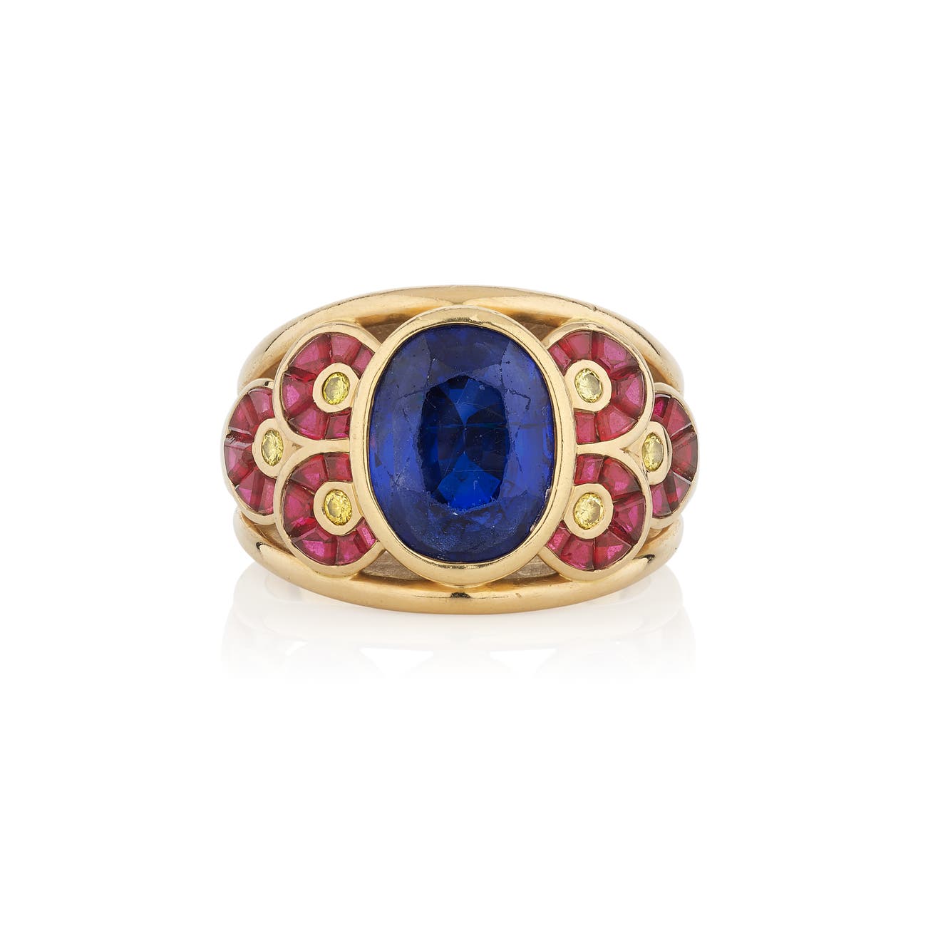 Set with an oval sapphire, decorated with calibé-cut rubies and circular-cut diamonds of yellow tint, size 57½, signed Schroeder.