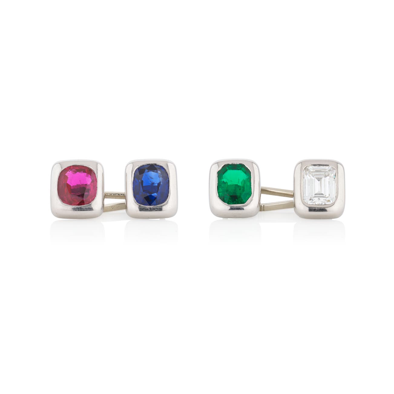 One set with a step-cut diamond and emerald, the other with a cushion-shaped ruby and sapphire, each measuring approximately 30x12mm, fitted case.