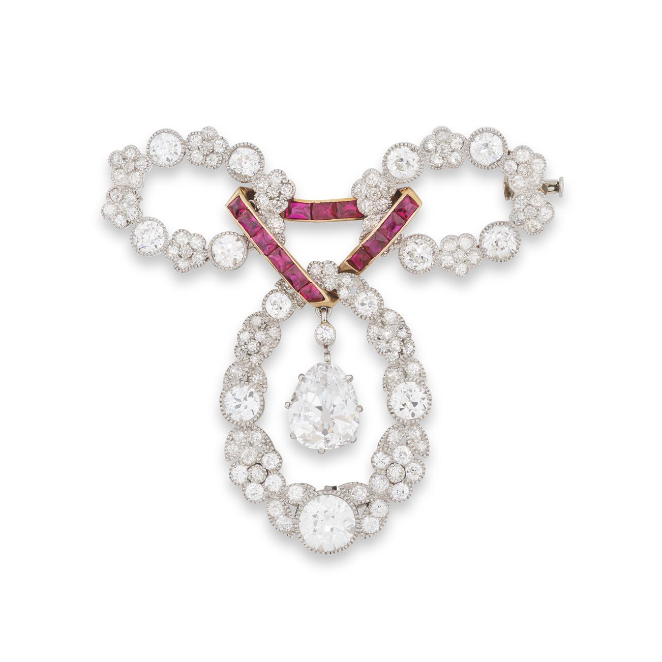 Of garland design, set throughout with circular- and single-cut diamonds, with calibré-cut ruby accents, supporting a pear shaped-diamond weighing 2.30 carats, measuring approximately 50x50mm, numbered.