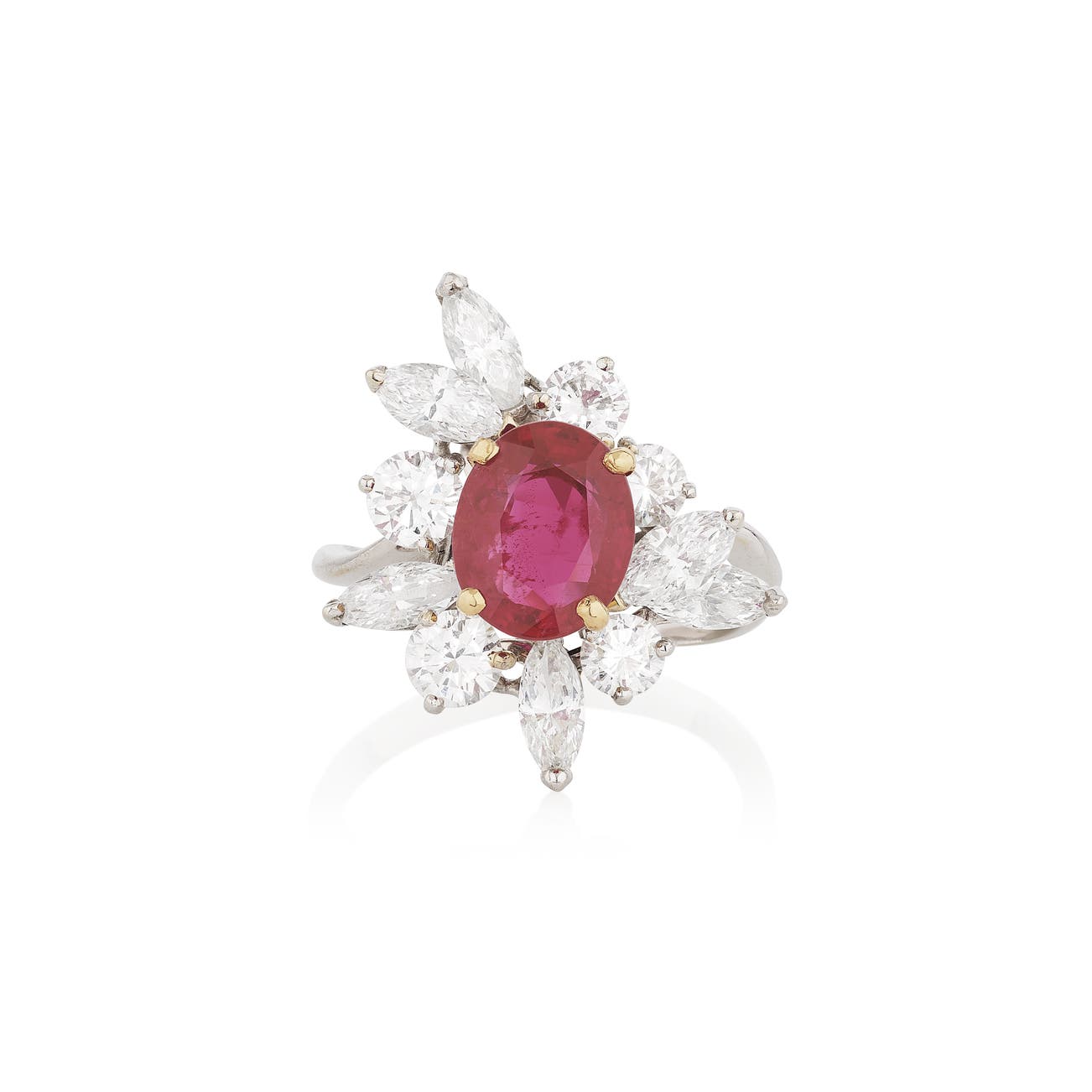 Set with an oval ruby weighing 2.22 carats, within a cluster of brilliant-cut and marquise-shaped diamonds, size 52, French assay mark for gold.