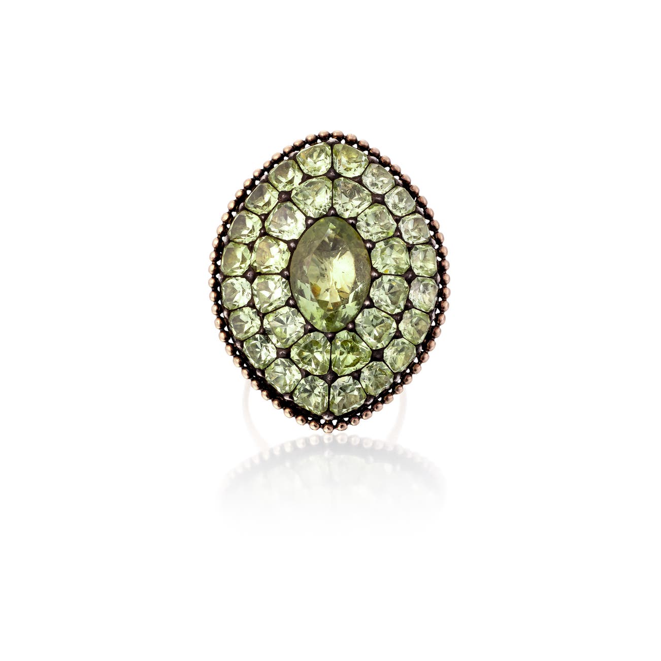 Set throughout with marquise- and shield-shaped chrysoberyls, decorated with a beaded boarder, closed-back mount,