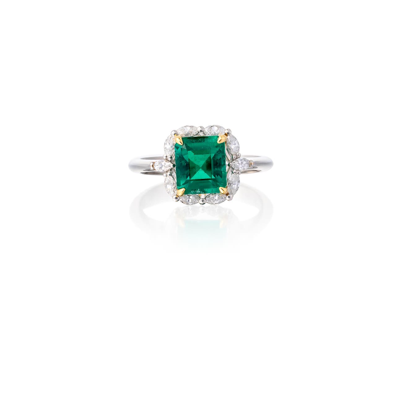 Set with a step-cut emerald weighing 1.56 carats, decorated with marquise-shaped diamonds, size 52.