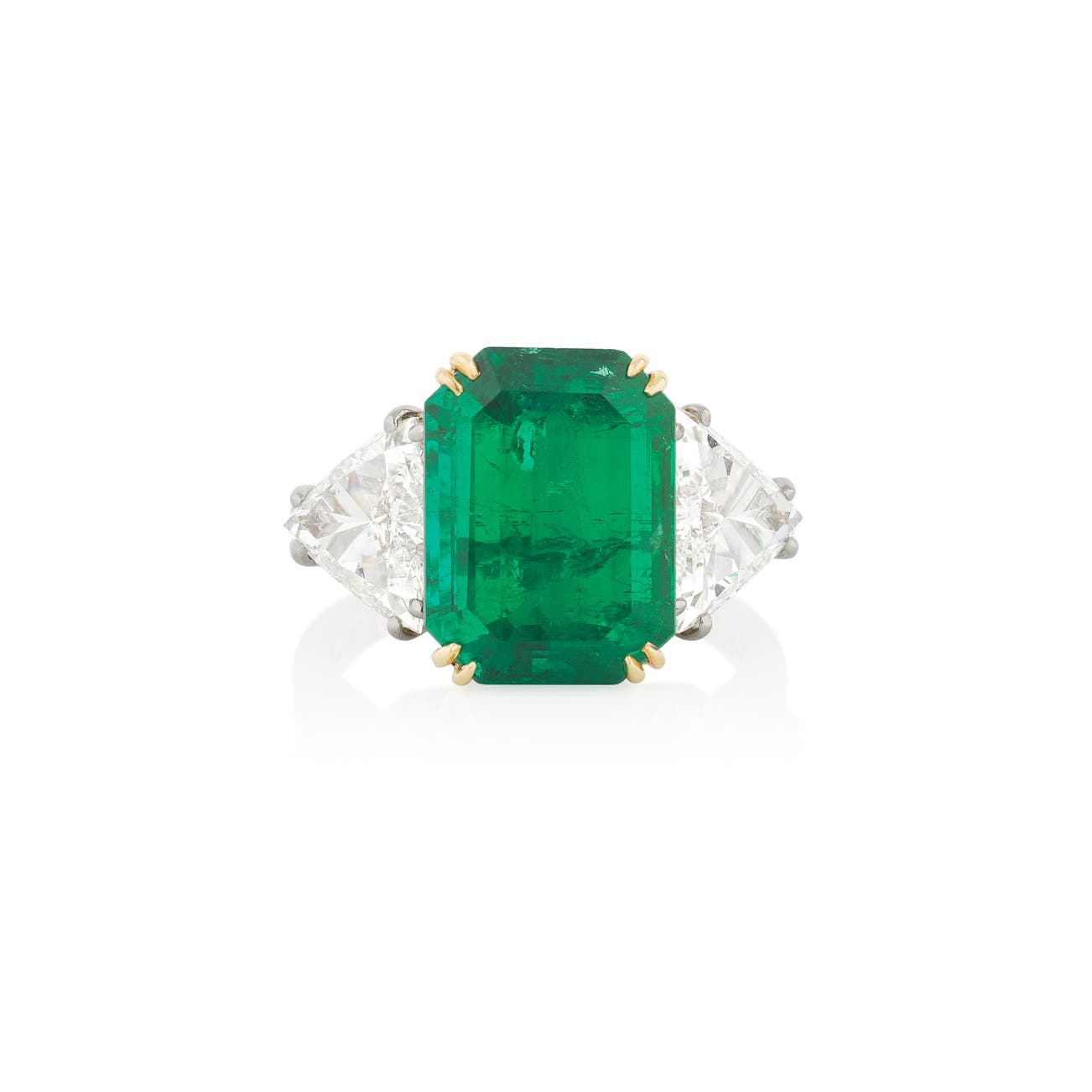 Set with a step-cut emerald weighing 6.13 carats, between triangular diamonds, size 51.