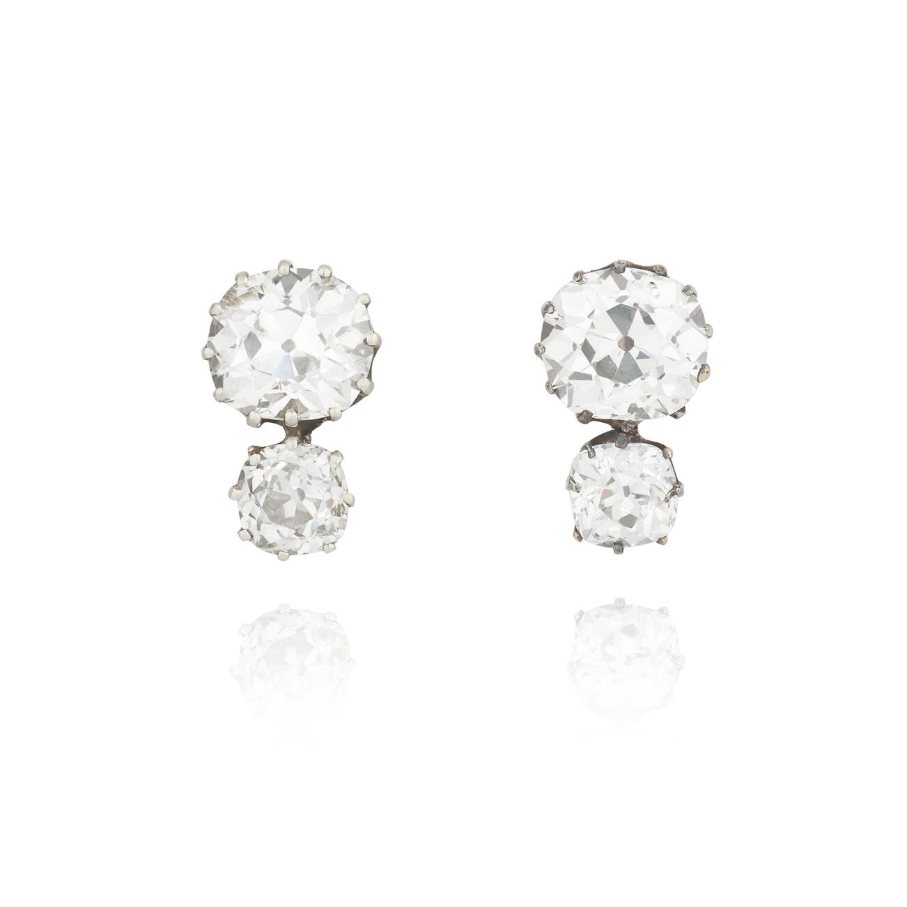 Each set with a cushion-shaped diamond weighing 3.82 and 3.68 carats respectively, each surmount set with a similarly shaped diamond weighing 1.35 and 1.48 carats respectively, Italian maker's marks and assay marks for gold, screw-back fittings.