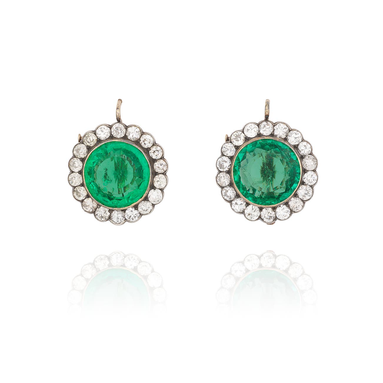 Each set with a circular-cut emerald within a surround of similarly cut diamonds, hook and hinged-back fittings, earring fittings detachable.