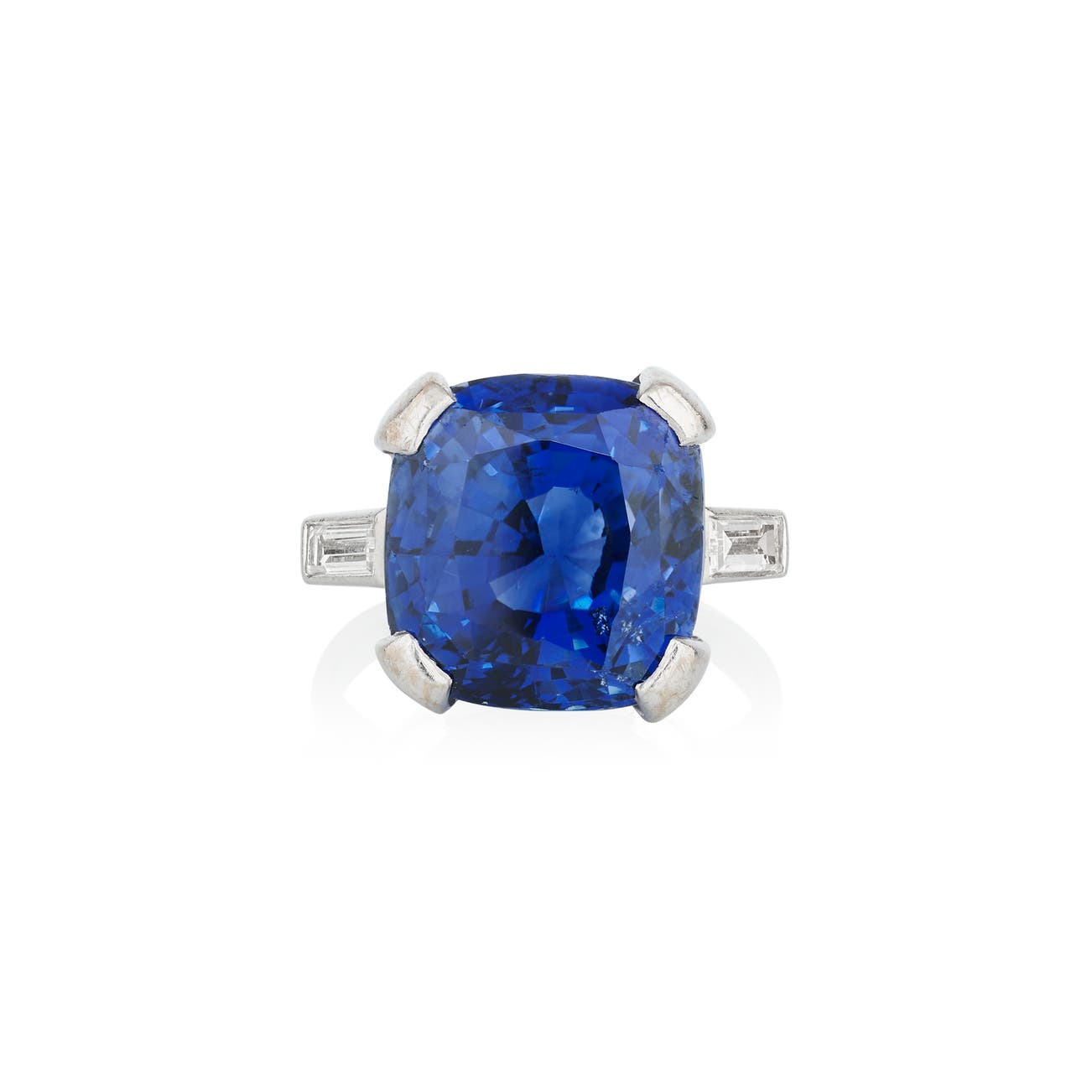 Set with a cushion-shaped sapphire weighing 18.87 carats, between baguette diamond shoulders, size 51.