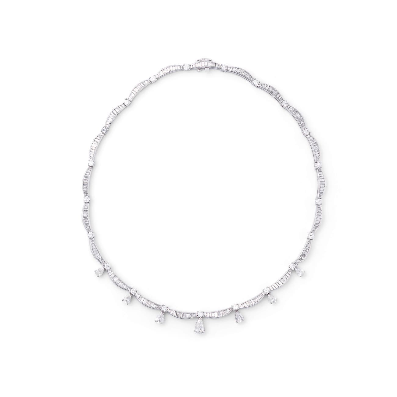 Of swag design, set with brilliant-cut and baguette diamonds, accented with pear-shaped diamonds,