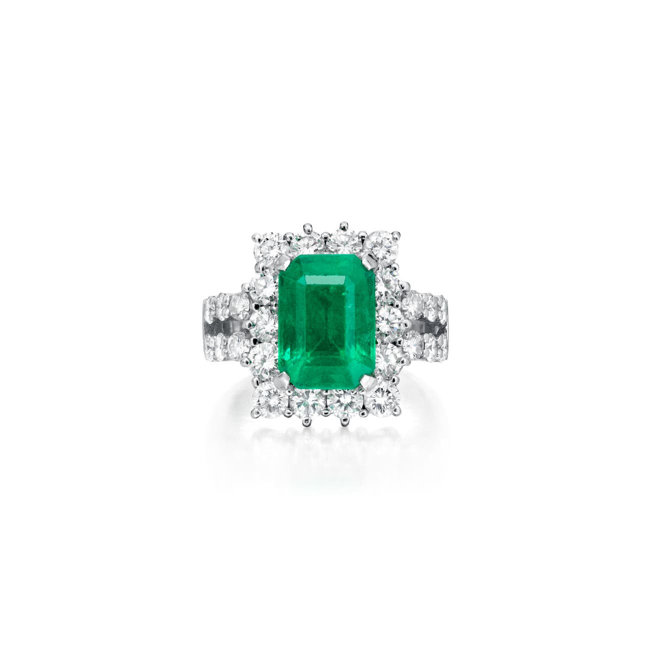 Set with a step-cut emerald, framed by brilliant-cut diamonds, mounted in platinum, size 7.