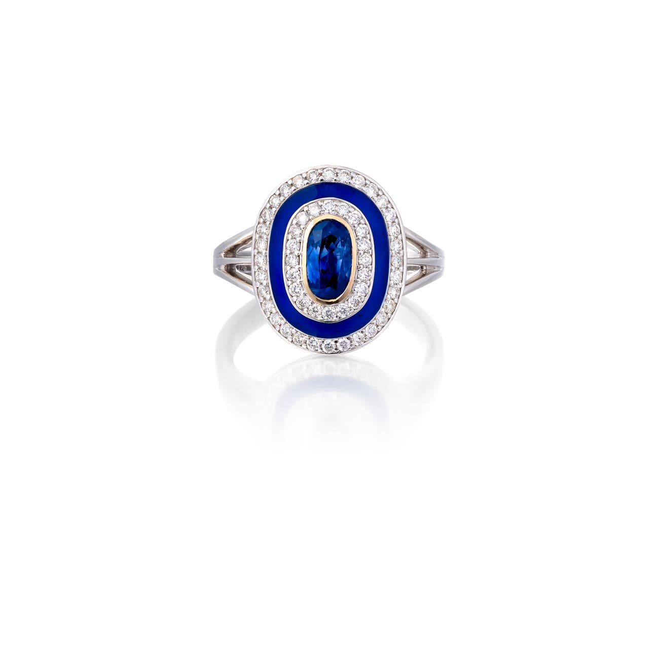 Set with an oval sapphire weighing 1.25 carats, accented with brilliant-cut diamonds and blue enamel, size 53