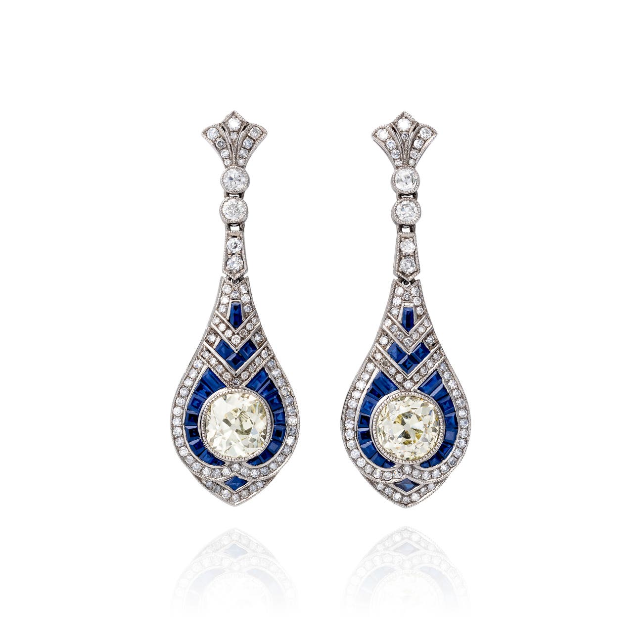 Each set with a circular-cut diamond, accented with calibré-cut sapphires and circular- and single-cut diamonds, length approximately 45mm.