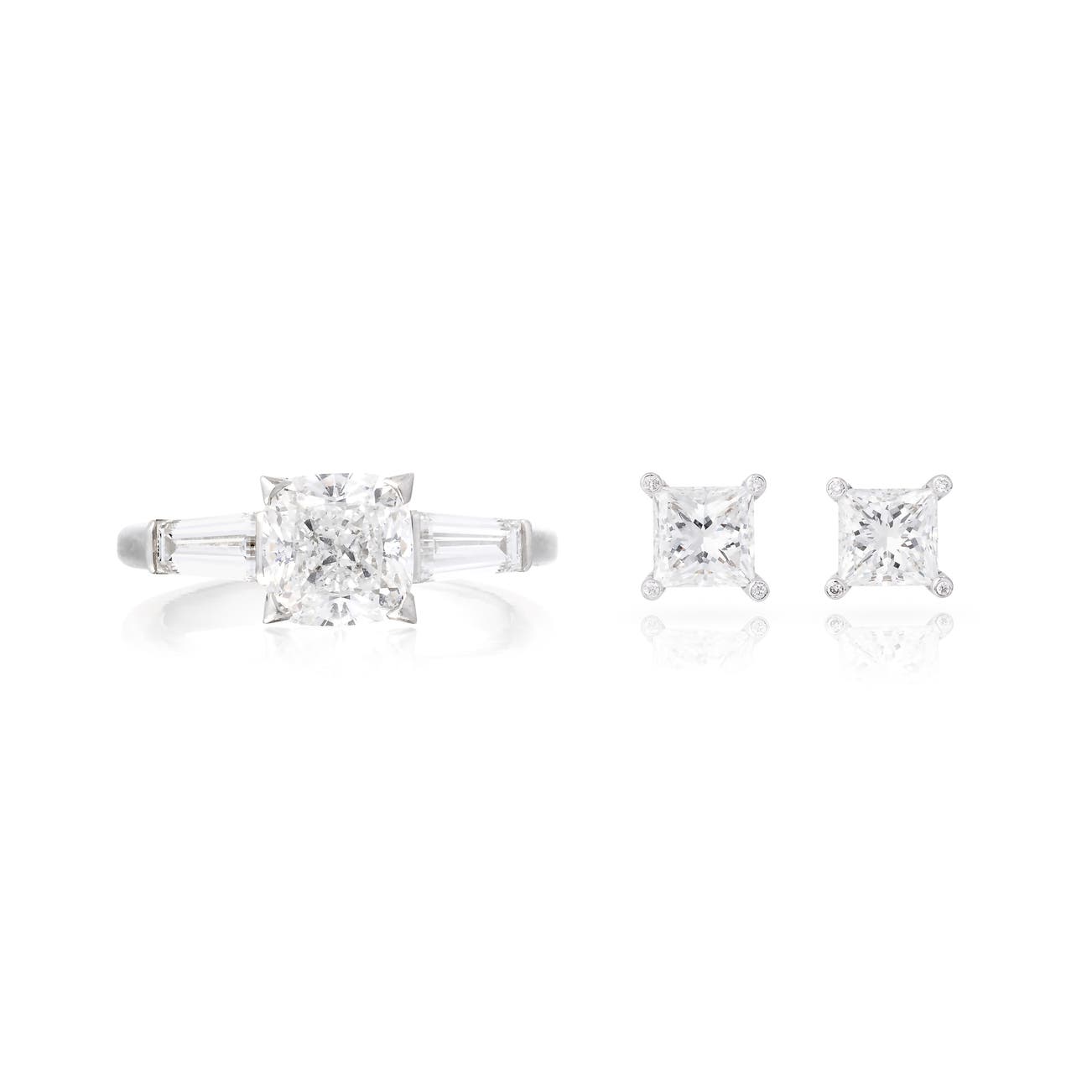 The ring set with a cushion modified brilliant-cut diamond weighing 2.21 carats, between tapered baguette diamond shoulders, the inside of the shank embellished with a brilliant-cut diamond, size 53½, each stud set with a princess-cut diamond weighing 1.01 carats, accented with brilliant-cut diamonds, each measuring approximately 14.34x6.78mm, post and Alpa fittings.