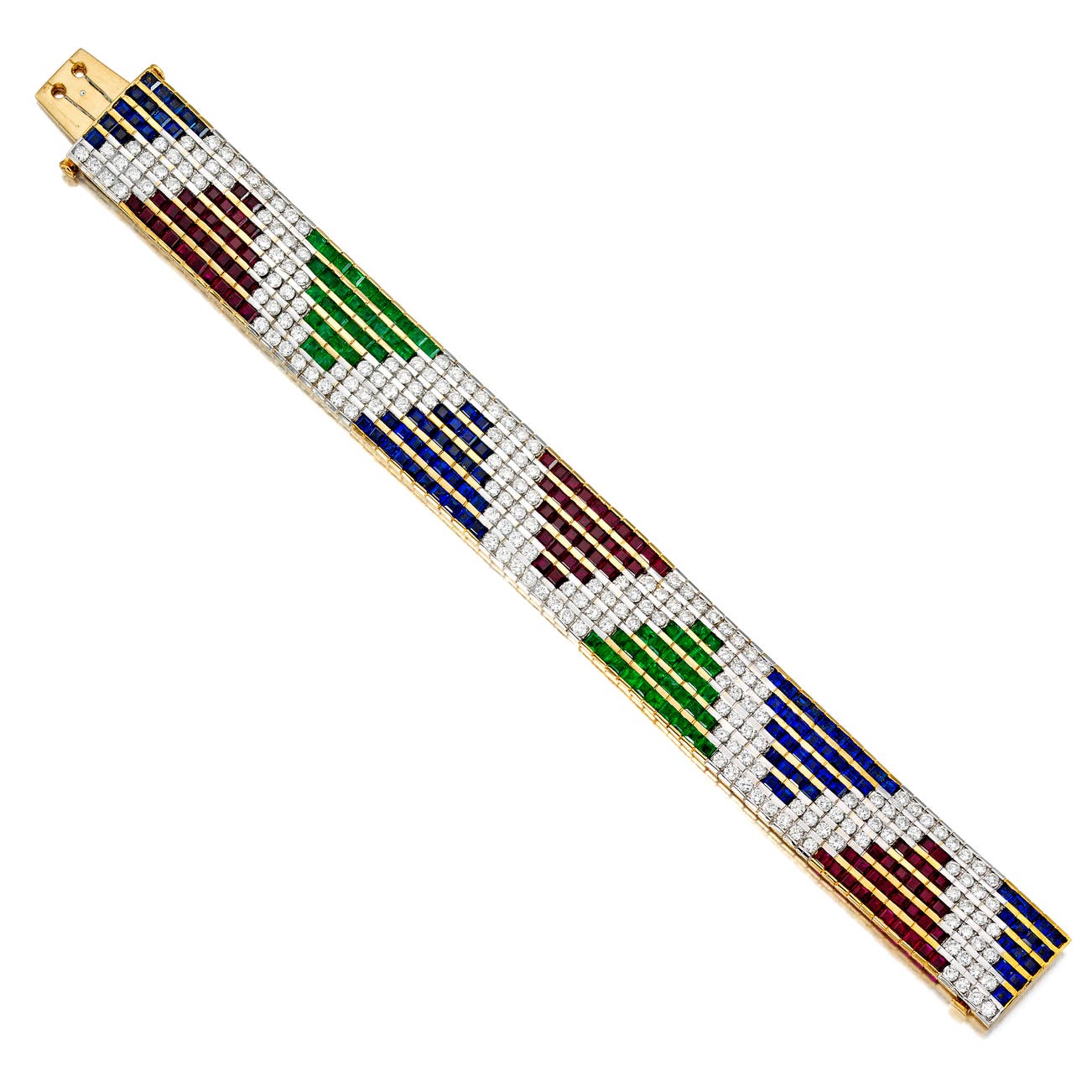 Set throughout with step-cut sapphires, rubies, emeralds and brilliant-cut diamonds, mounted in 18k yellow gold, length approximately 7 inches.