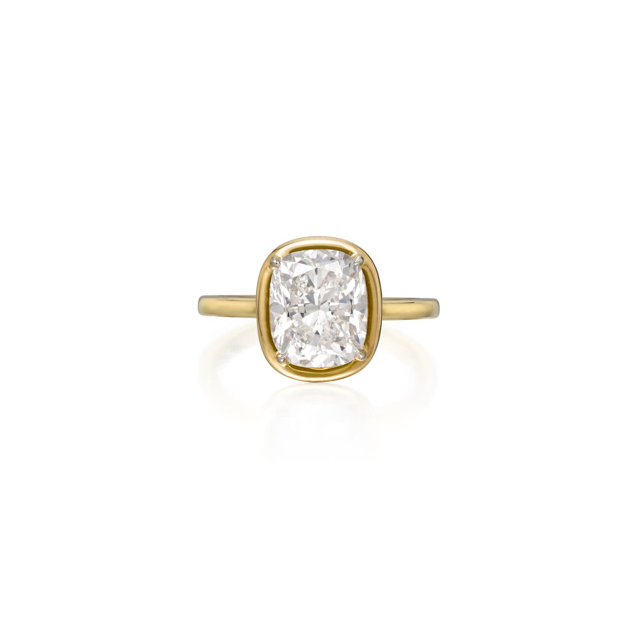 Set with a cushion-shaped diamond weighing 3.02 carats, mounted in 18k yellow gold, size 6.