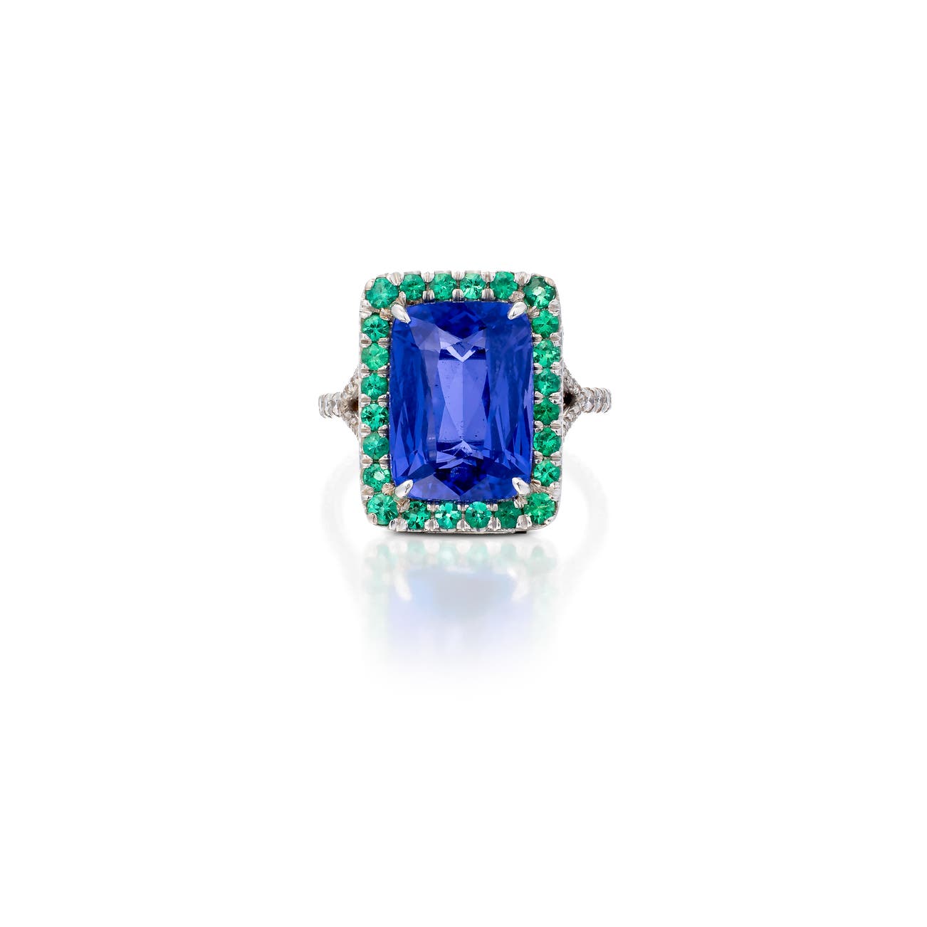 Set with a cushion-shaped tanzanite weighing 7.81 carats, surrounded by circular-cut emeralds and accented with brilliant-cut diamonds, size 52.