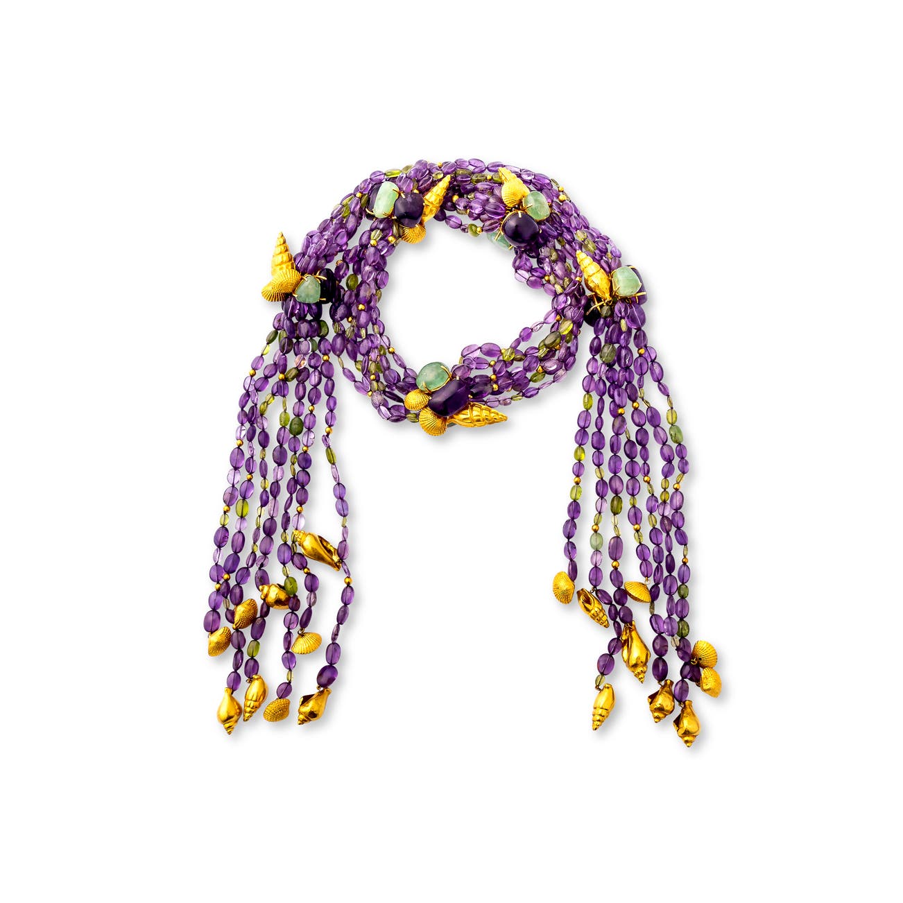 Designed as alternating eight and seven strands of polished amethyst, peridot and gold beads, joined by clusters of cabochon amethysts and emeralds with gold accents of shell design, length of the longest strand approximately 1180mm.