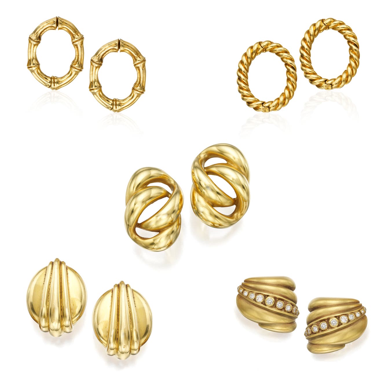 One pair of earrings, in 18k yellow gold, measuring approximately 1 inch, signed Webb, one pair of earrings, in yellow gold, measuring approximately 1 inch, one pair of earrings, set with brilliant-cut diamonds, mounted in 18k yellow gold, measuring approximately 3/4 inches, signed Vahe Naltchayan, one pair of cufflinks, in 18k yellow gold, measuring approximately 1 inch, signed Webb, one pair of cufflinks, in 18k yellow gold, measuring approximately 1 inch, signed Tiffany & Co.