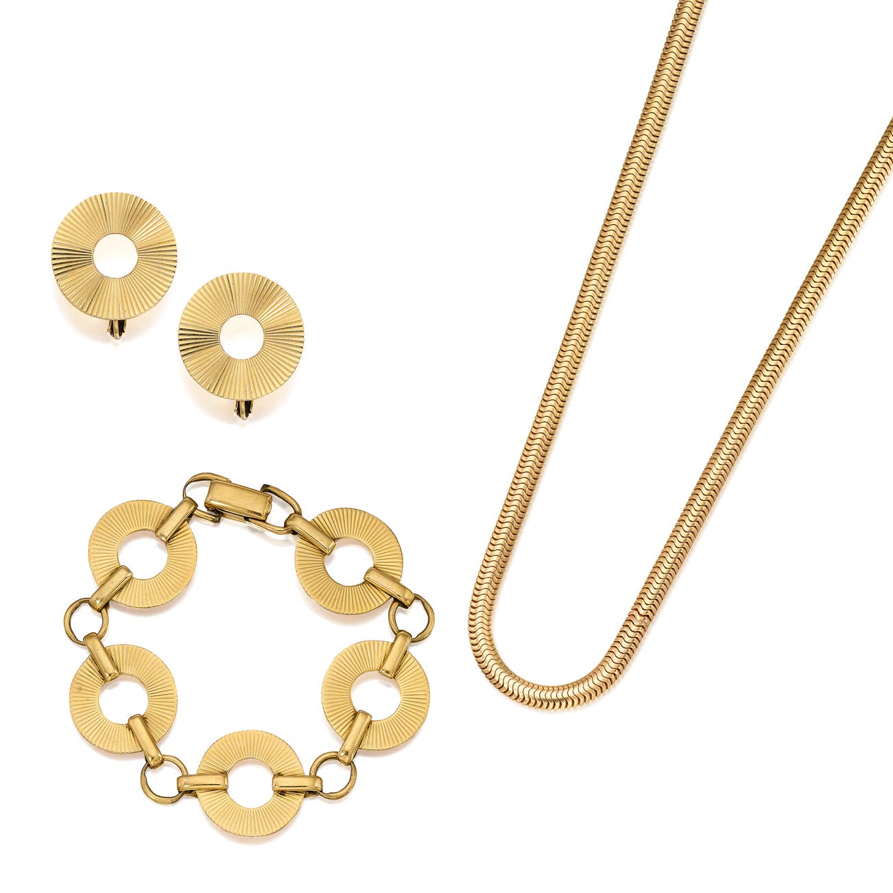 Comprising: a necklace, measuring approximately 19 5/8 inches, a bracelet, measuring approximately 7 3/4 inches, and a pair of earrings, measuring approximately 1 inch, each in 14k yellow gold.