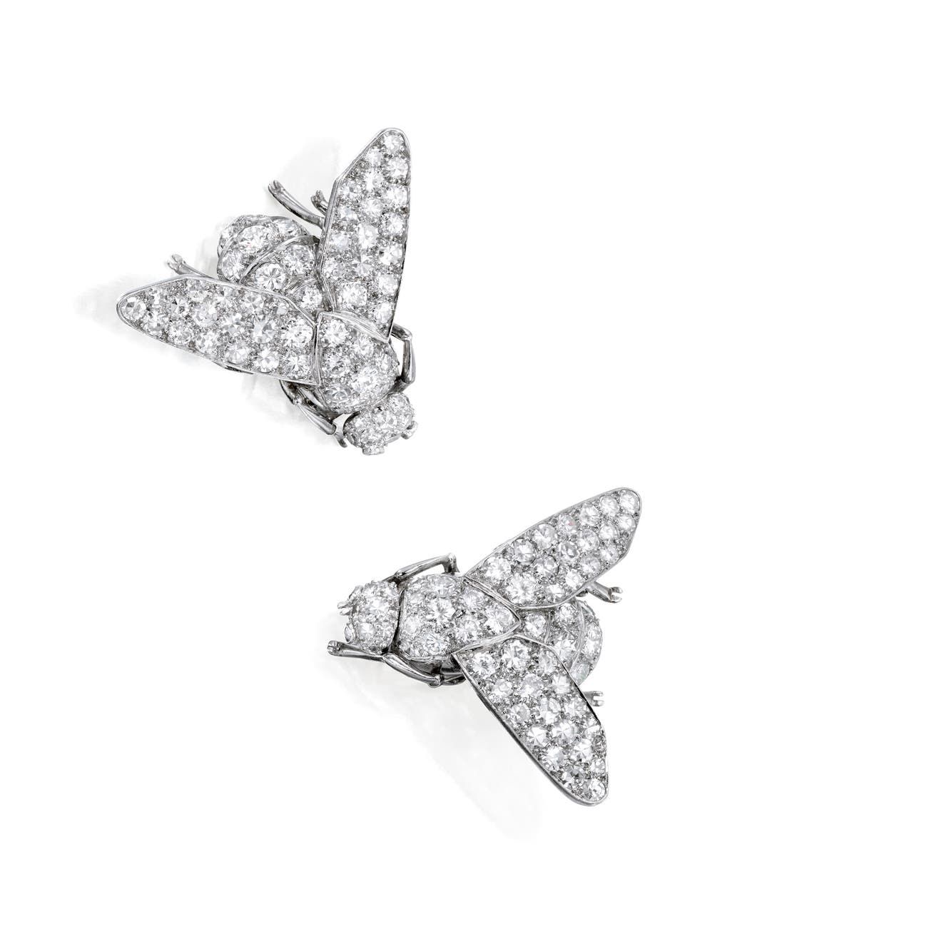 Designed as bees, each set with single- and brilliant-cut diamonds, mounted in platinum, each measuring approximately 7/8 x 1 inch, signed Marc Rio.
