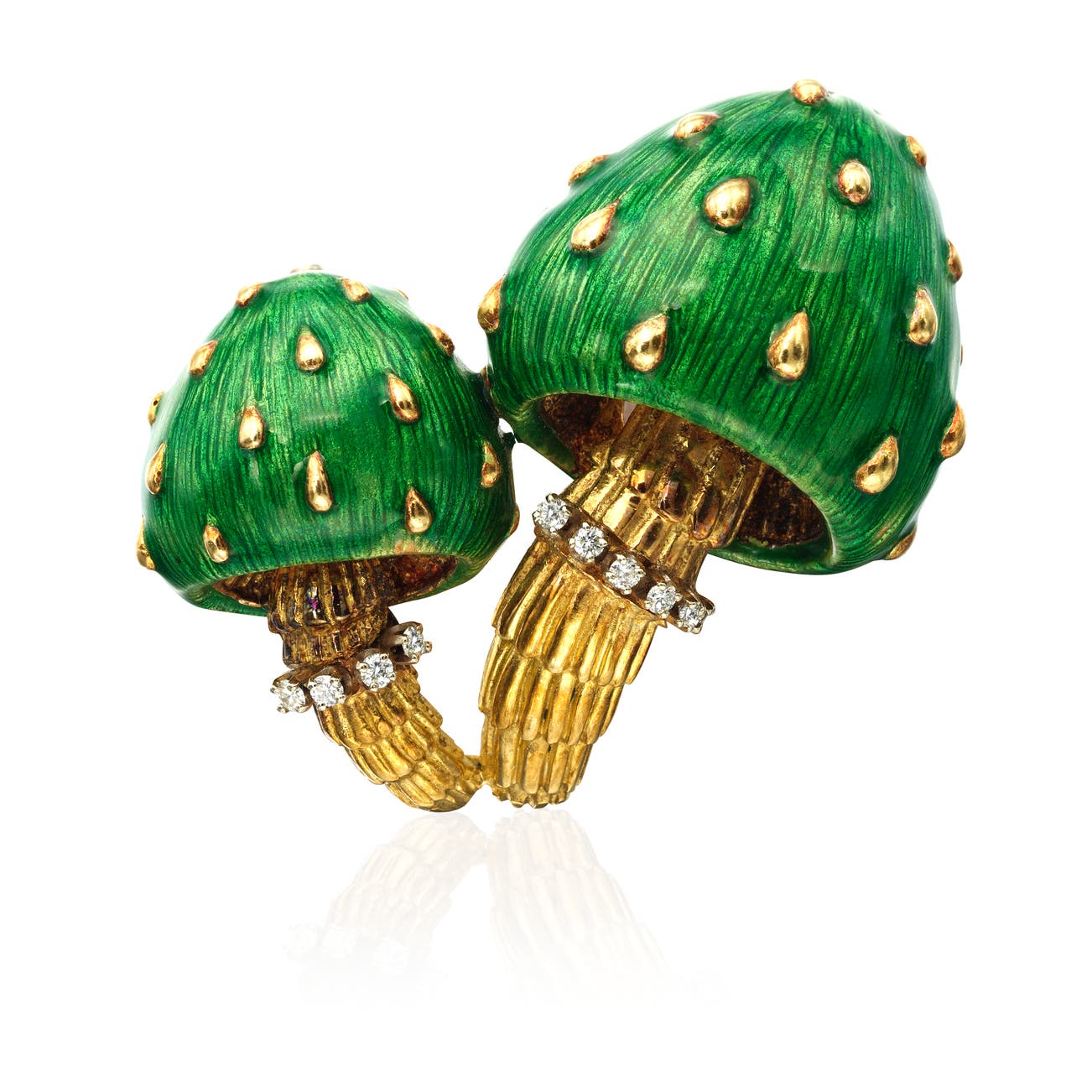 Gold studded mushroom caps with applied green enamel, accented by brilliant-cut diamonds, mounted in yellow gold, measuring approximately 2 x 1 3/4 inches.