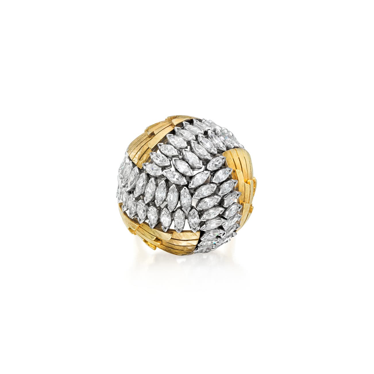 Of bombé design, set with marquise-shaped diamonds,