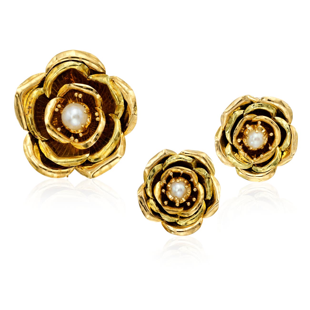 Designed as flowers, each centering a cultured pearl, a brooch mounted in yellow gold, measuring approximately 1 1/2 inches, a pair of earrings, mounted in yellow gold, measuring approximately 1 inch.
