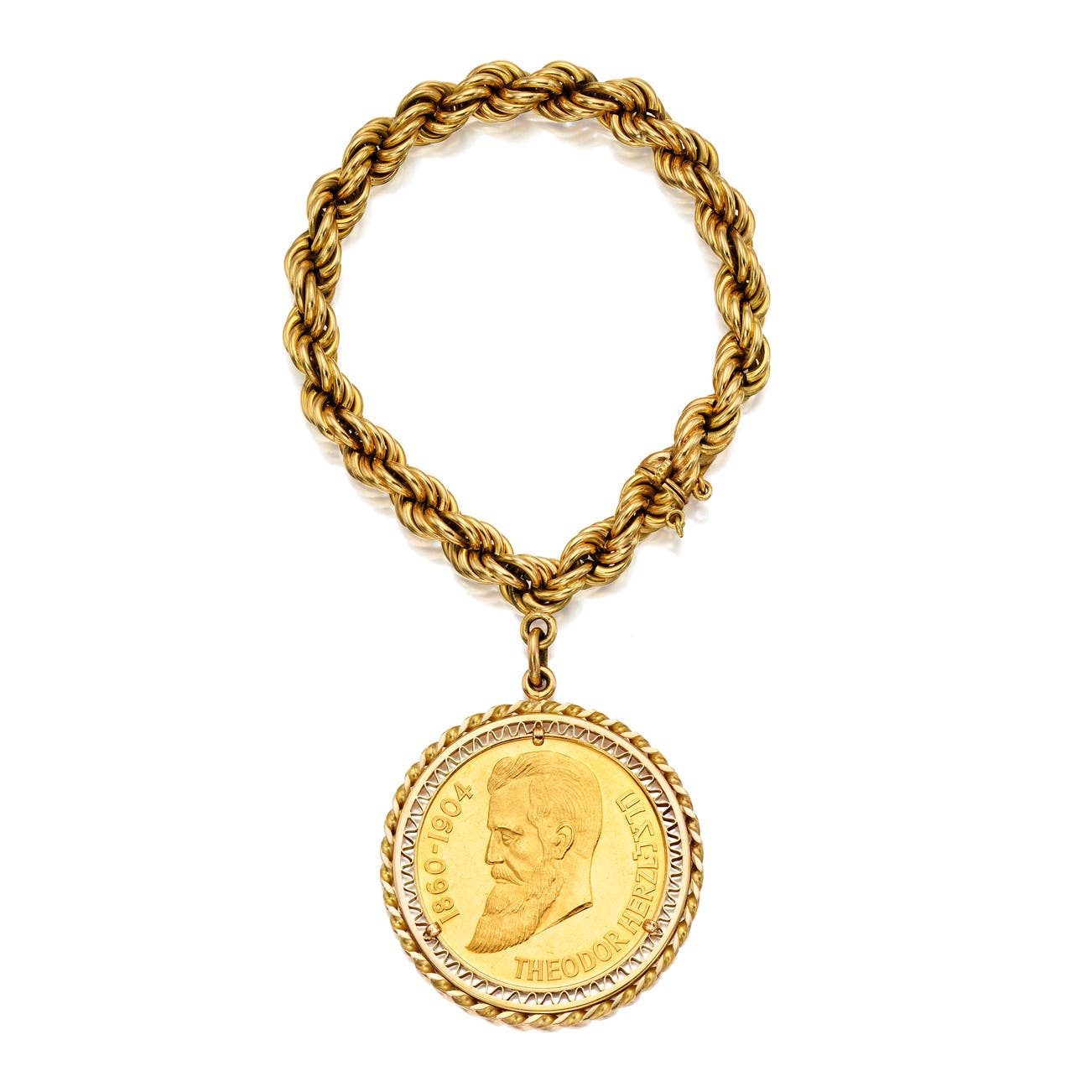in 18k yellow gold, inner circumference approximately 7 inches and coin measuring approximately 1 3/4 inches.