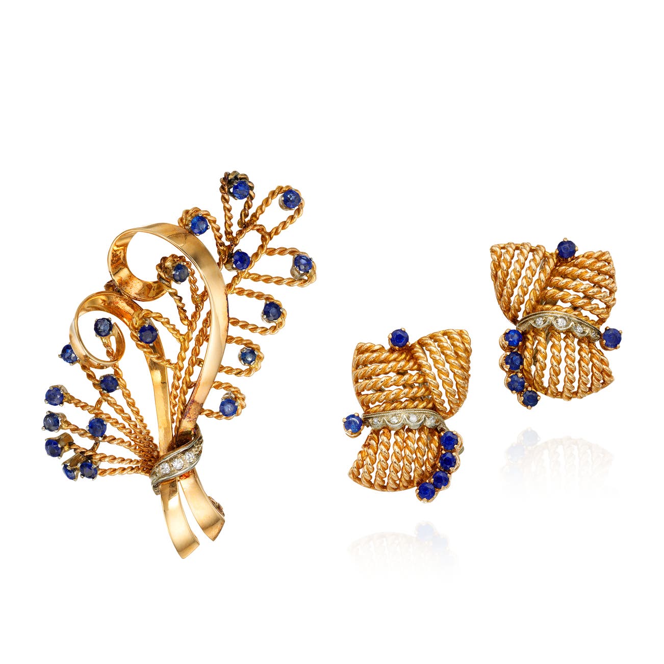 Sapphire, Diamond and Gold Brooch and Pair of Ear Clips