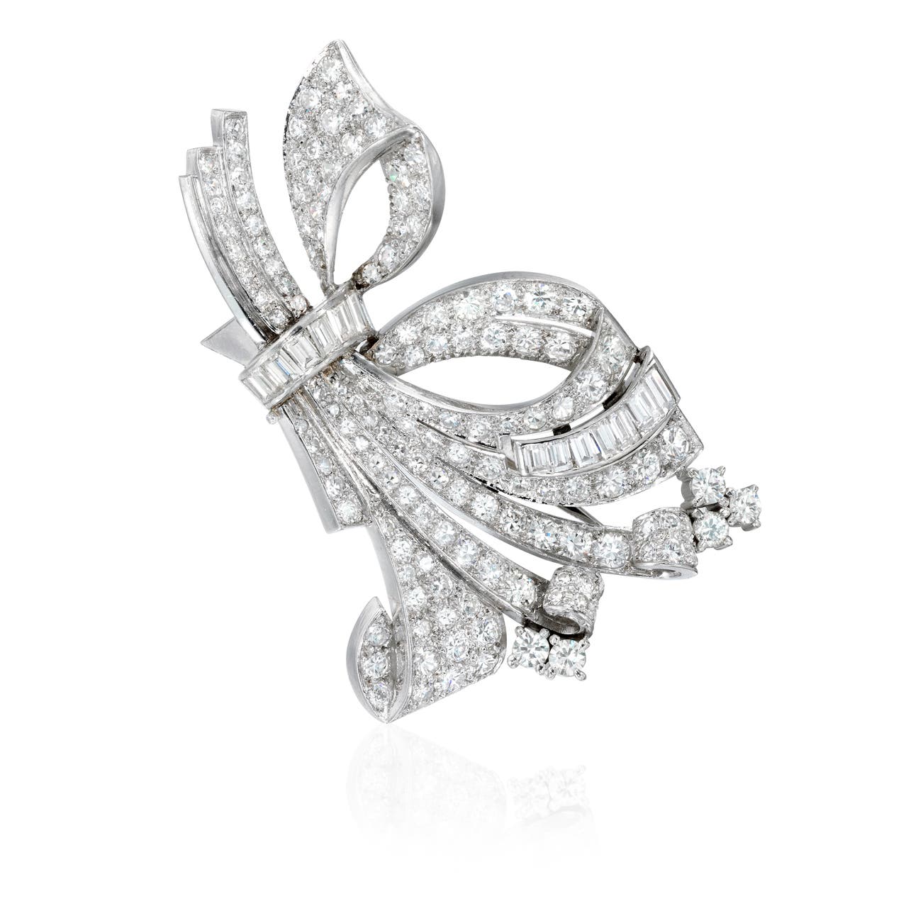 Designed as a bow, set with circular- and single-cut diamonds, mounted in platinum, length measuring approximately 2 2/5 x 1 1/2 inches.