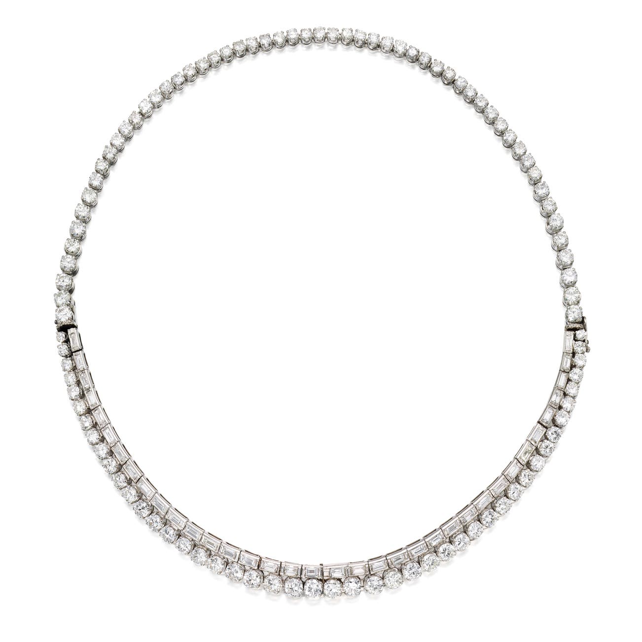 Set with graduating brilliant-cut diamonds, accented by baguette diamonds,