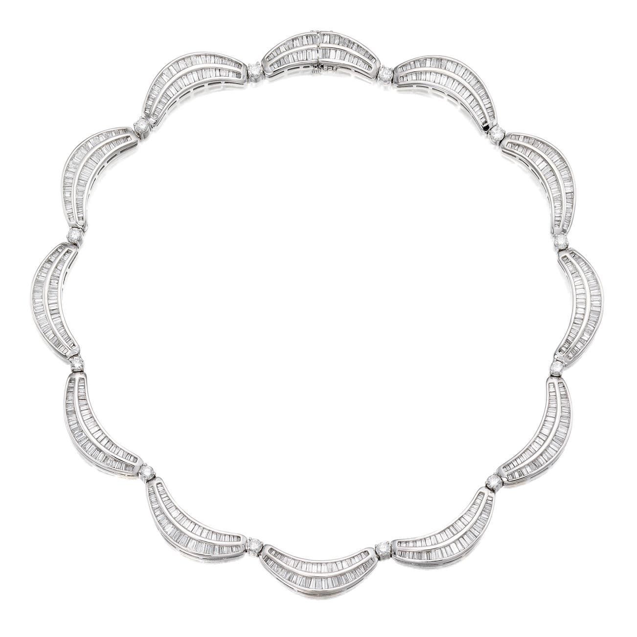 Scalloped motifs set with baguette and tapered baguette diamonds, joined by brilliant-cut diamonds,