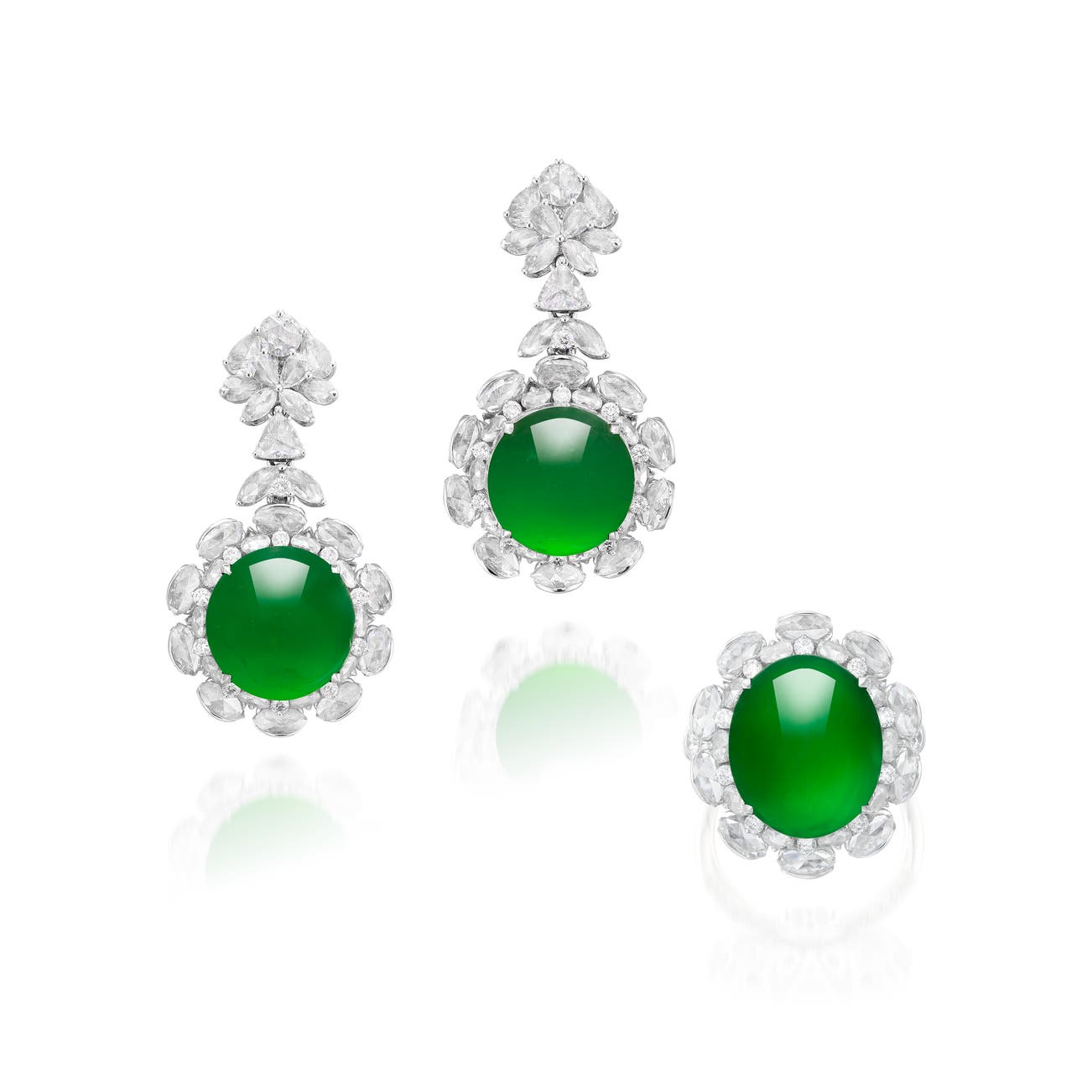 Comprising: a pair of earrings, each set with a jadeite cabochon measuring approximately 12.25-12.68 x 4.49 mm and 12.22-12.25 x 4.20 mm respectively, of bright green colour and very good translucency, to the diamond set surround and surmount; and a ring en suite, set with an oval jadeite cabochon measuring approximately 14.97 x 12.55 x 6.10 mm, of similar colour and translucency, earrings with post and butterfly fittings and length approximately 34 mm, ring size 6¼.
