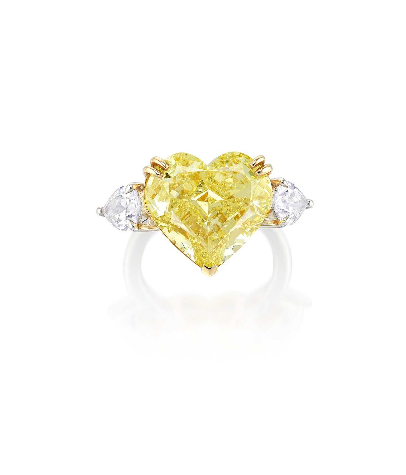 Set with a heart-shaped fancy yellow diamond weighing 11.08 carats, between two pear-shaped diamonds, mounted in white and yellow gold, size 5¾.