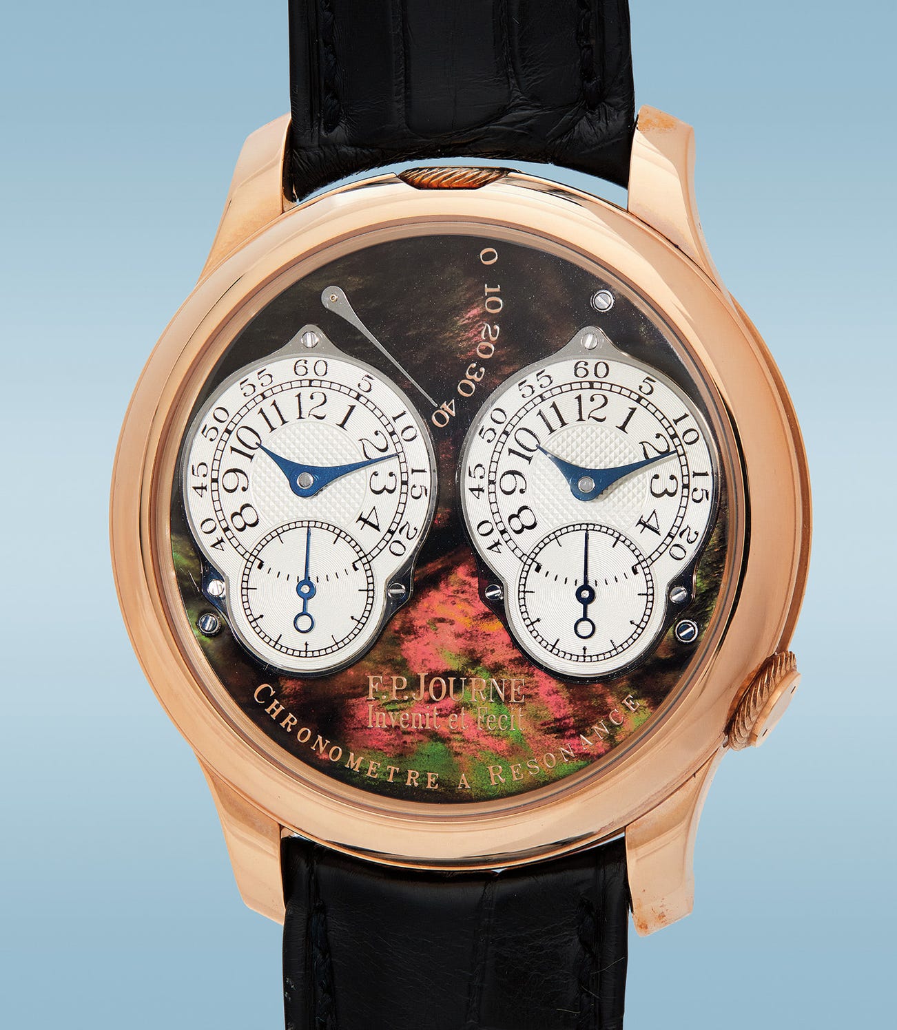 Inspired by the work of the great 18th century watchmaker Antide Janvier, Journe rose to the challenge in 1983 and created a pocket-watch using the resonance phenomenon and launched a wristwatch 17 years later. In 2000, F.P. Journe took the horological world by surprise with the introduction of the first-ever wristwatch incorporating two resonating escapements. The movement is composed of two independent balances, alternatively serving as an “exciter” and “resonator”. Simply summarised, the idea behind a resonance timepiece is that two independent escapements placed in close proximity influence and synchronise with one another, the two synced escapements being more resilient to disturbances than a single escapement. Two escapements united are less prone to error. Additionally, the Chronomètre à Resonance is also an extremely useful dual time watch, with two twelve hour time zones displayed on two identical sudbidals adjacent to each other.