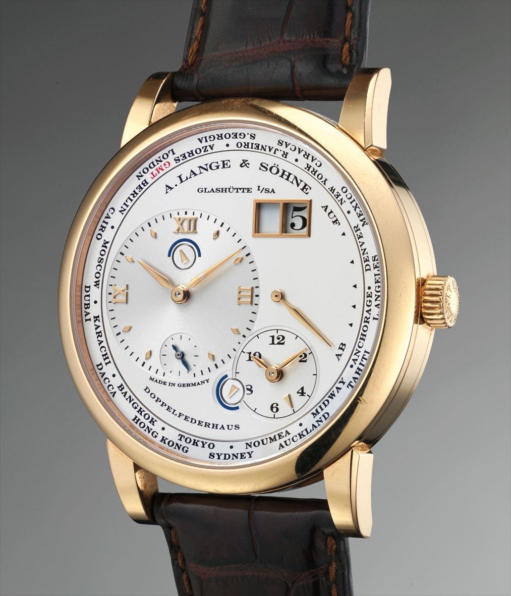 Loyal to its reputation of mechanical mastery, Lange presented the Lange 1 Timezone in 2005, offering a complex movement, the dual time zone, in an user-friendly package. The main dial decentered to the left indicates home time, with at the top a day/night indicator and the continuous seconds subdial at the bottom. On the lower right hand side is a smaller subdial indicating the second time zone with a small arrow pointing to the city ring indicating the timezone the wearer is in. A small subdial also indicates day/night in the second timezone. Of course, the present lot also features all the signature elements found in the Lange 1 such as the decentered big date and power reserve indicator.