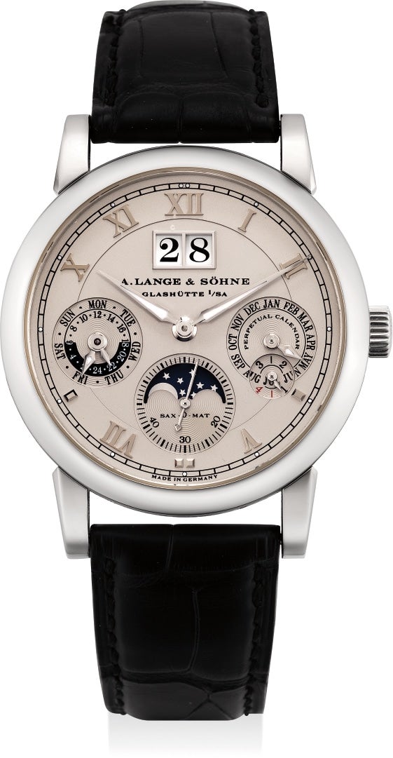 朗格,「Langematik Perpetual」型號310.025,非常精細及罕有,鉑金自動上弦腕錶,配萬年曆、閏年、月相及日夜顯示,約2005年製。附錶盒、證書、調整筆和配件