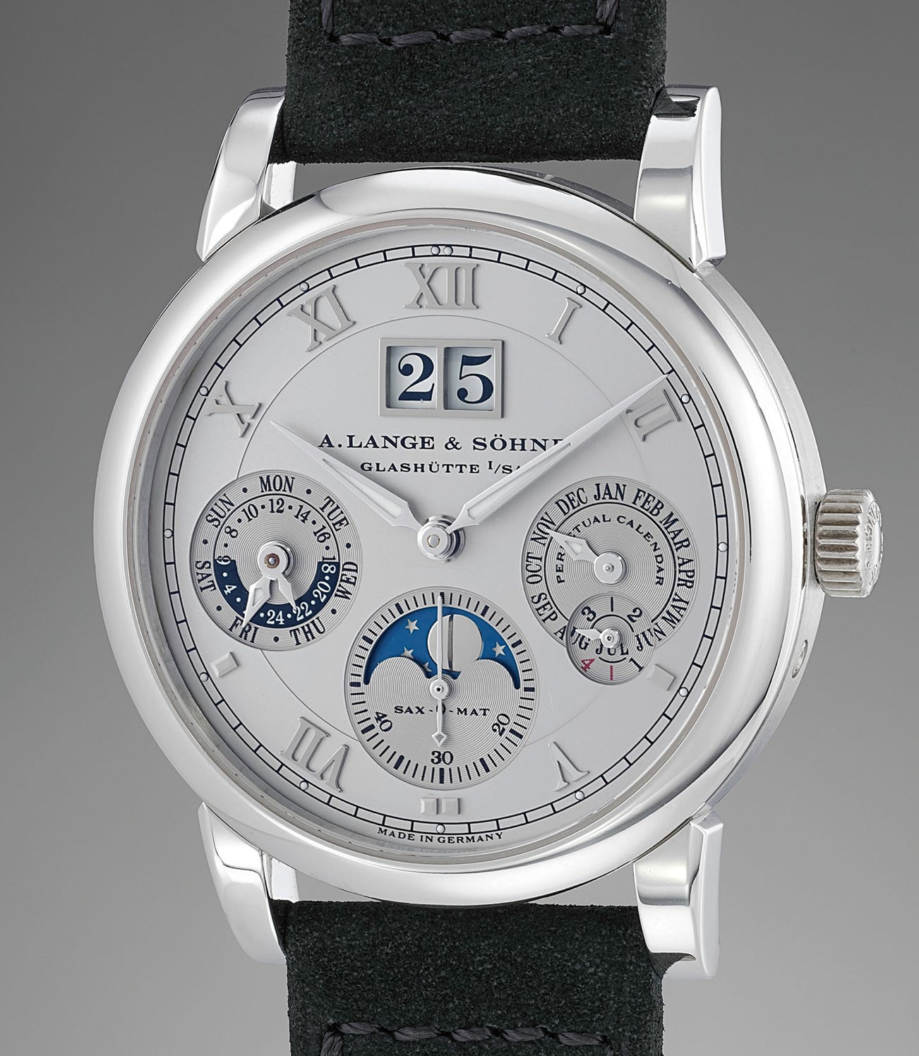 Reference 310.025E is one of Lange & Söhne’s interpretations of one of the most classic, useful and sought-after horological complications: the perpetual calendar. The most noticeable feature of the model is the presence of the large date windows at 12, a “signature” characteristic of the brand. The rest of the information is arranged with supreme elegance around the 3 subsidiary counters: the one at 3 o’clock shows the month and features a smaller subdial for the leap year cycle, the one at 6 shows the phase of the moon and the constant seconds, and the one at 9 indicated the day of the week and the 24 hours indication. The final result is a dial which conveys the complexity of the movement without resulting unencumbered with superfluous information, the sign of a true masterpiece of design.