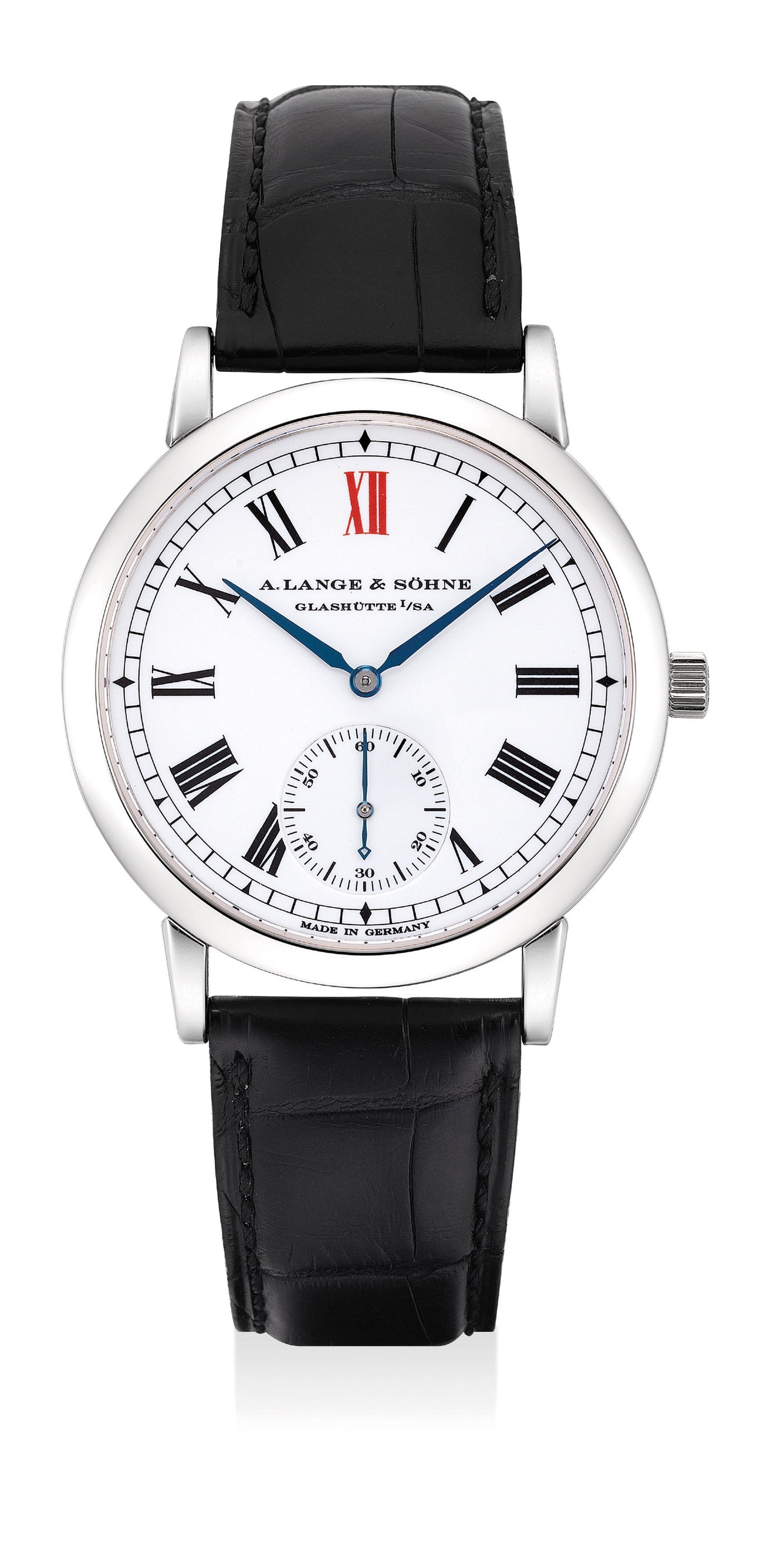 Most impressively, the watch features an gorgeously executed white enamel dial with red Roman XII. This red 12 refers to old pocket watches, as the finest quality was also made with a red 12. The mechanical automatic self-winding ALS caliber L921.7 "Sax-O-Mat" movement is made from Glashütte 3/4 plate in German silver, with fausses cotes embellishment. It's constructed with 36 jewels, 307 components, a hand-engraved balance bridge, a shock absorber mechanism, and a straight-line lever escapement.