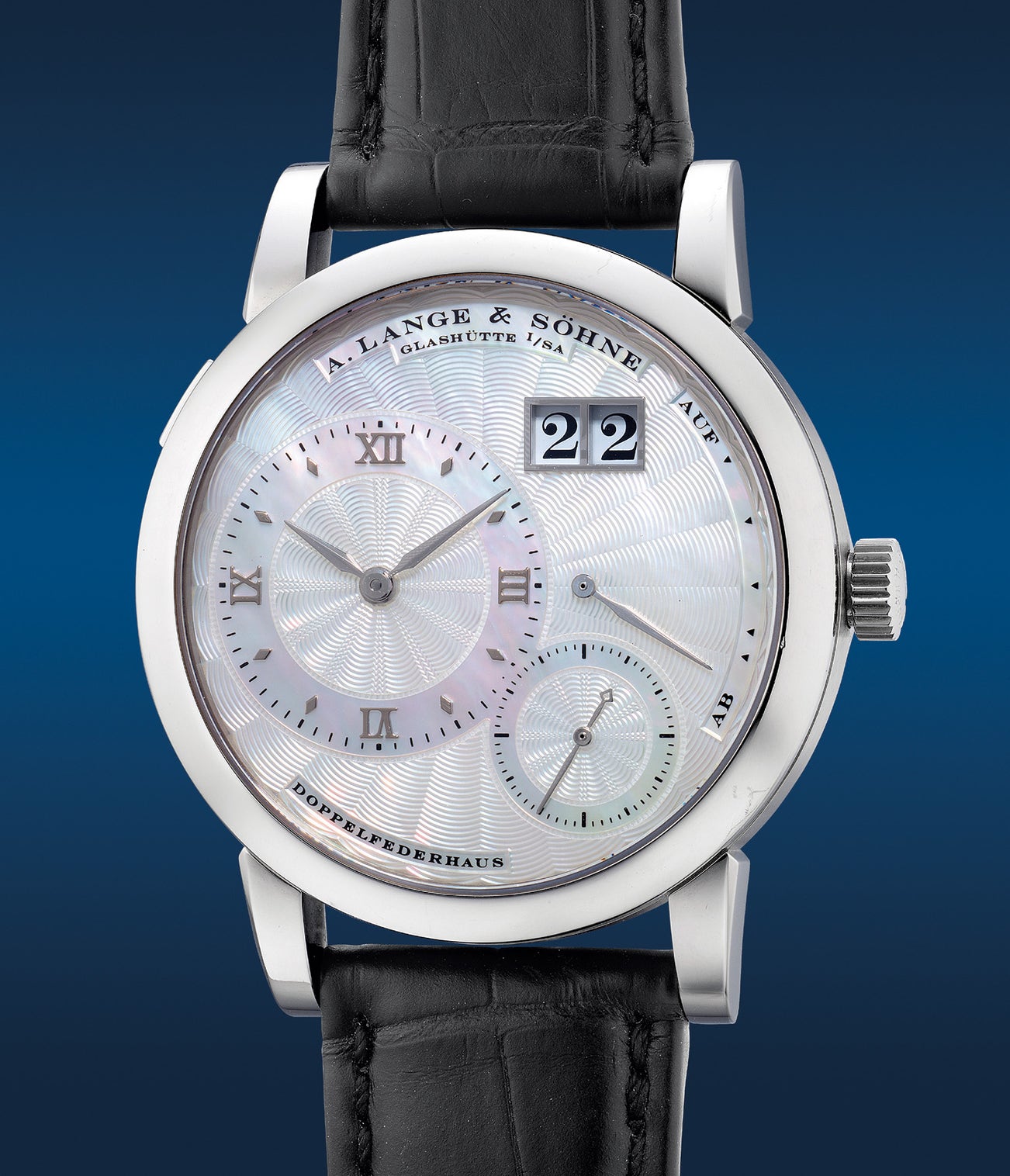 朗格,「Lange 1 Soirée」型號 110.030,精細及非常罕有,白金腕錶,備天然珠母貝璣鏤錶盤、日期、動力儲存顯示,約2002年製