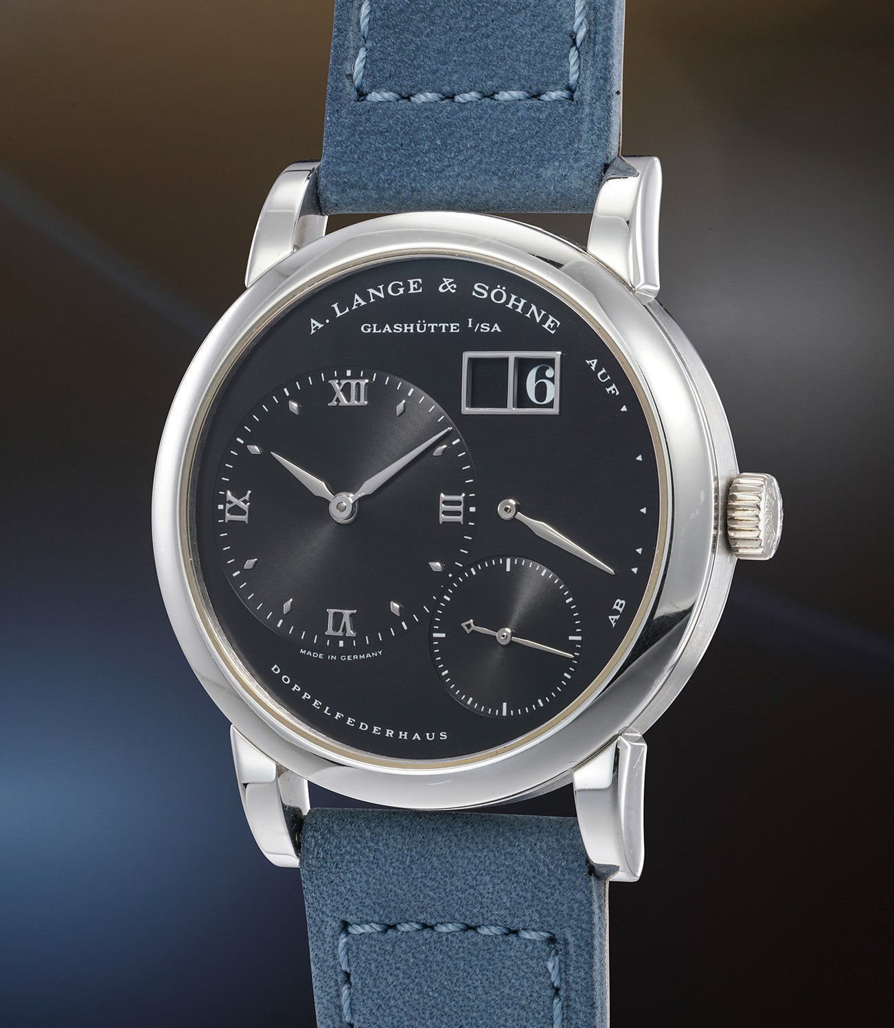 Amongst the collection, the Lange 1 reference 101.035 was produced in small quantities exclusively between 1999-2006 and sets itself apart from its breed. Cased in platinum with a distinctive monochromatic all black configuration and a handsome “white on black” date disc, the model was nicknamed by collectors “Darth” and enjoys a cult-like following.