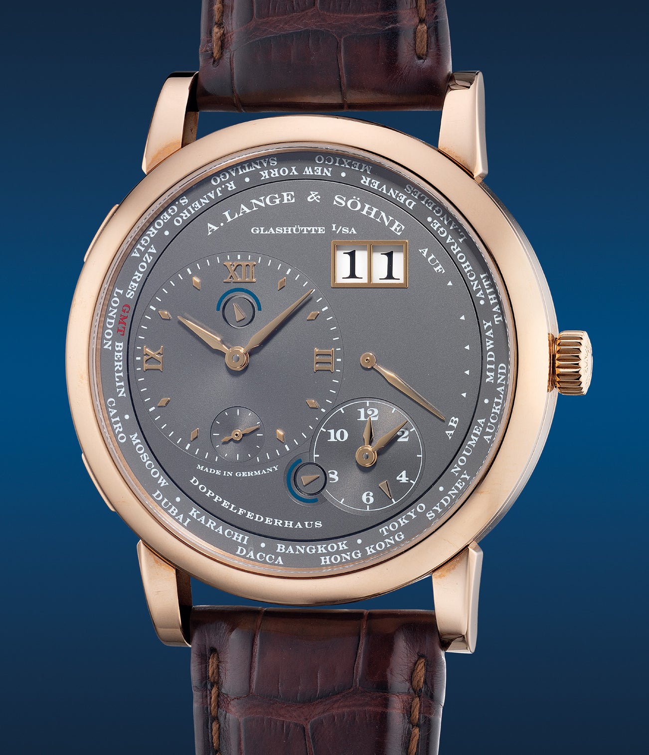 朗格,「Lange 1 Time Zone」型號116.033,精細, 玫瑰金世界時區腕錶,備小秒針、日期、兩地日夜顯示、動力儲存,約2009年製。附錶盒、原裝證書