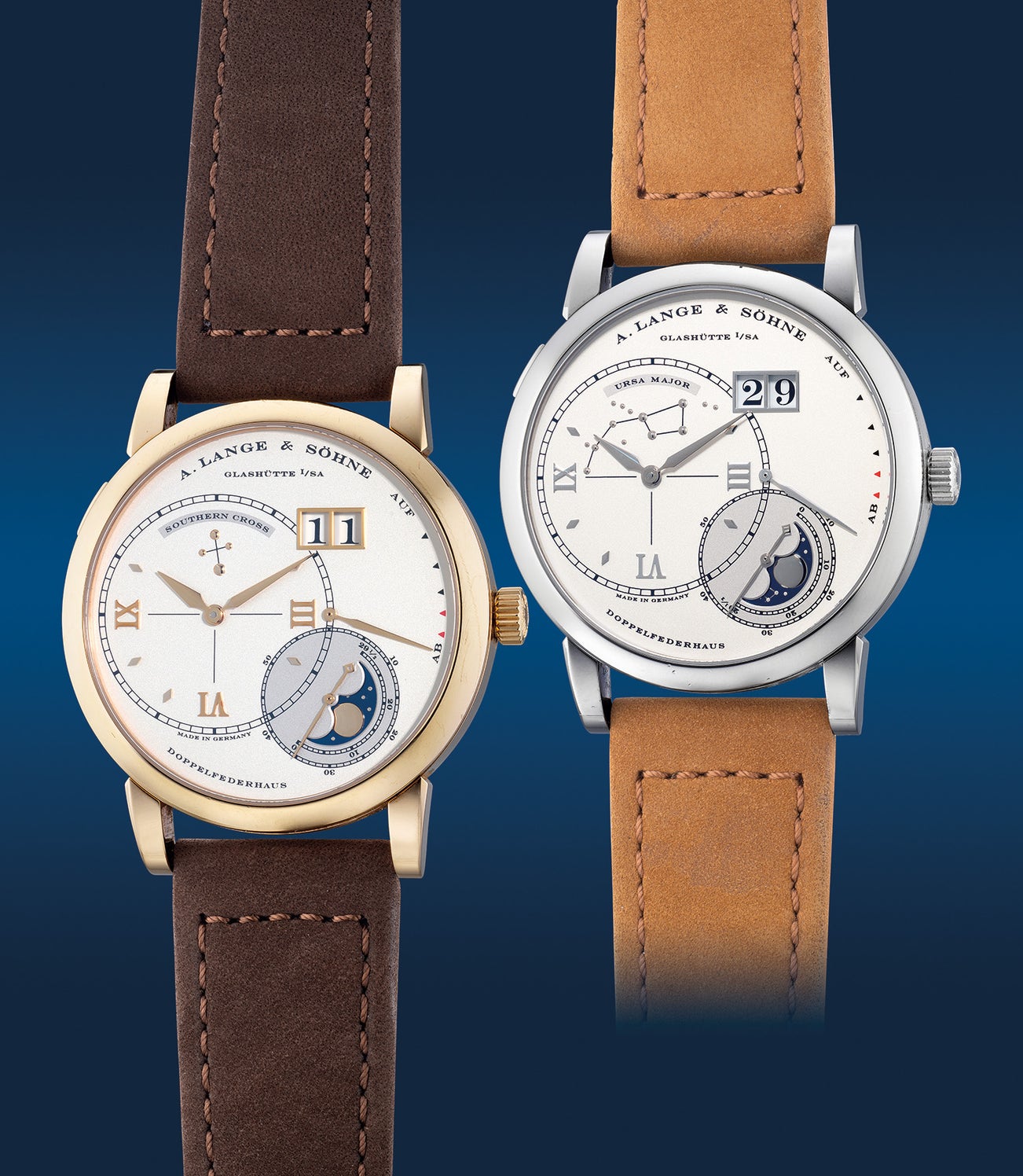 Initially launched in 2003 as a limited edition of 101 pieces, of which the present set is number 8, The Grand Lange 1 "Luna Mundi" is delivered as a set of two watches, respectively, the Luna Mundi Ursa Major and Luna Mundi Southern Cross.