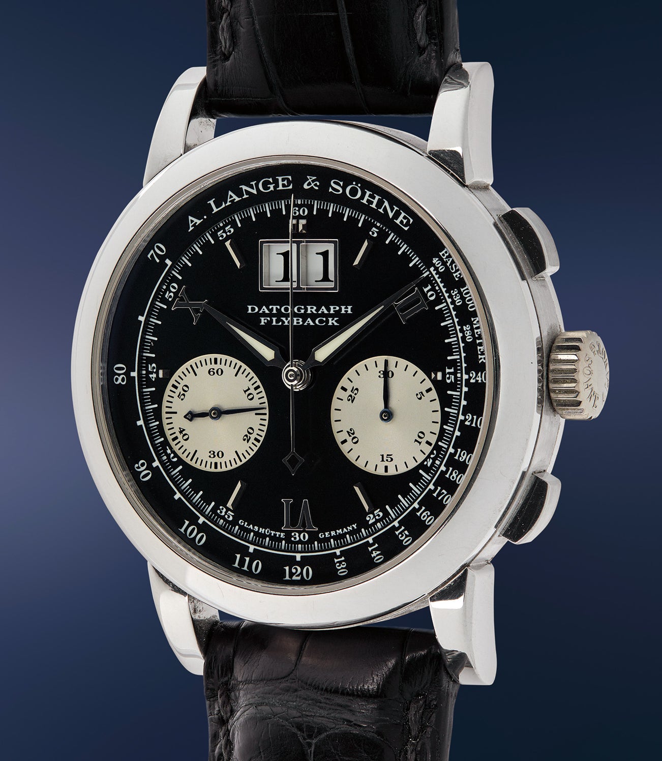 The first generation of the Datograph features a 39mm diameter case without a power reserve indication, giving the dial a clean and simplistic appeal. Furthermore, the platinum case and black dial is the original Datograph that captured the admiration of so many collectors and connoisseurs when it first appeared at Baselworld in 1999. The present reference 403.035 displays many of the tiny peculiarities that set the earliest Datographs apart from their later counterparts and excite keen-eyed connoisseurs. Indicative of a first-generation example, the present lot bears a desirable “METER” dial, rather than “meters” on the tachymeter track, only seen in pieces produced before 2005. The German silver subdials have taken on a subtle patination, another feature of first-generation examples.