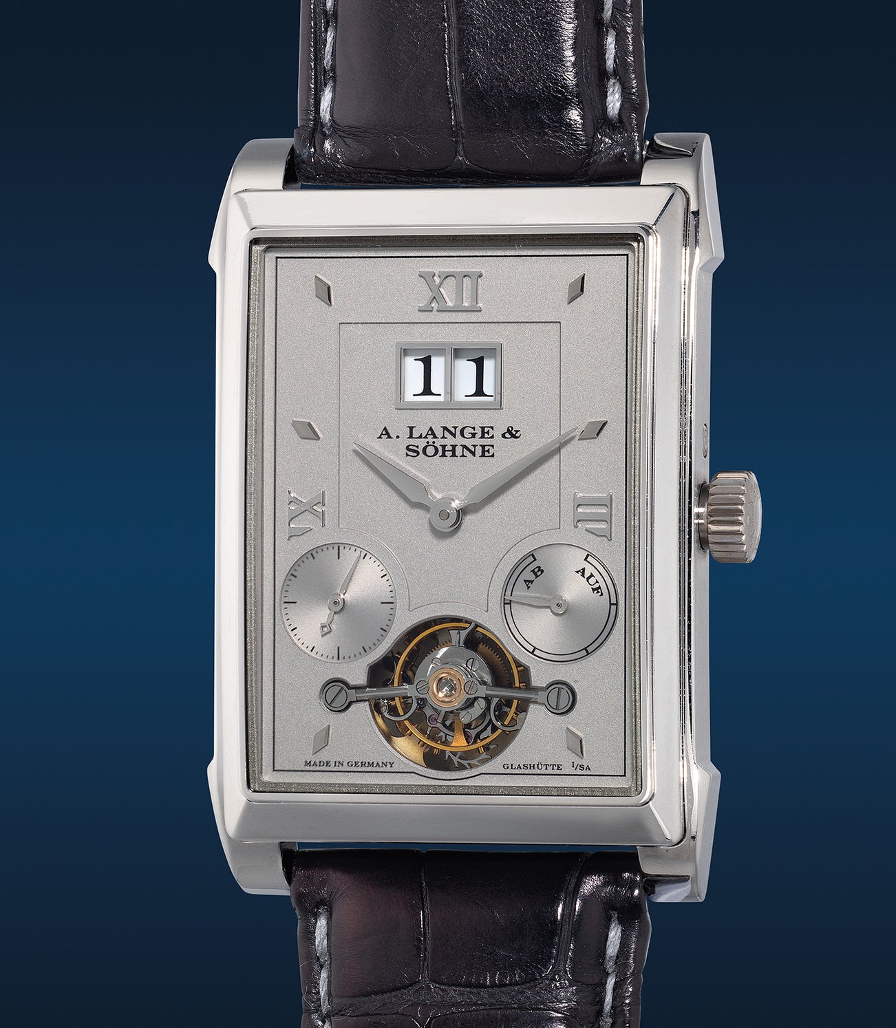 朗格,「Cabaret Tourbillon」型號 703.025F,精細優雅,鉑金長方形陀飛輪腕錶,備日期及動力儲存顯示,約2008年製。 附原裝證書、調整筆、錶盒