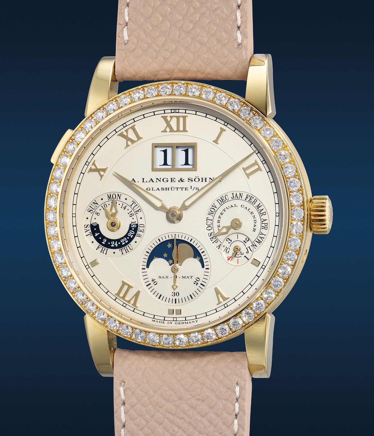 朗格,「Saxonia Langematik Perpetual」型號820.021E,罕有、精細,黃金鑲鑽自動萬年曆腕錶,備特大日曆視窗、專利歸零裝置、閏年、月相、24小時顯示,約2005年製。
