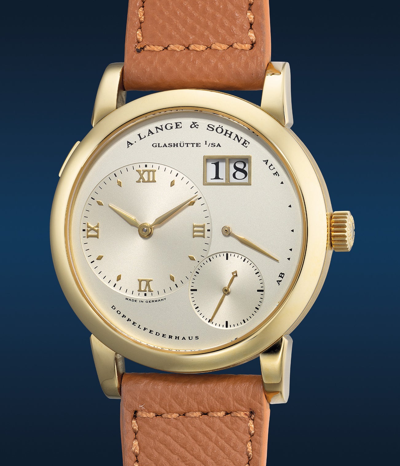 朗格,「Lange 1」型號101.001,罕有早期,黃金腕錶,備小秒針、動力儲備、日期顯示,約1996年製。附原裝證書、備用底蓋